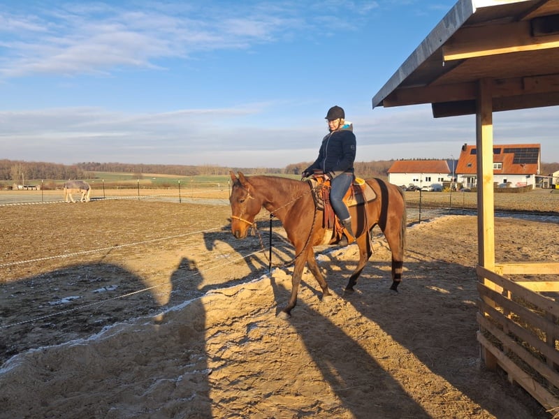 Ich suche für meine wunderschöne Stute ein neues Zuhause, weil es zwischen uns einfach nicht passt. Amy ist Western geritten und reagiert fein auf Gewichts- und Schenkelhilfen. Sie möchte gefallen und gearbeitet werden. Sie ist nach Pat Parelli gearbeitet und lernt relativ schnell. Sie geht ohne Probleme alleine ins Gelände oder auch in einer Gruppe. Amy ist kein Anfänger Pferd, da sie einen sicheren Reiter braucht, dem sie vertrauen kann. Kennt Gebiss und gebisslose Zäumung. Gibt sehr schön die Hufe und steht gut beim Schmied. Sie kennt Offenstall und tagsüber Padock/ nachts Box. Aktuell steht sie mit einem Pony zusammen, sie ist eher ranghoch. Wir suchen für sie ein neues Zuhause, in dem sie gefordert und dadurch gefördert wird. Ein passender Westernsattel kann dazu erworben werden. Wird ausschließlich in liebevolle und verantwortungsvolle Hände abgegeben. Ein schönes neues Zuhause für sie ist uns wichtig! Wen Amy verzaubert hat, meldet euch bei uns. Ich stehe für Fragen bereit, gerne schicke ich auf Anfrage Videos und ein Kennenlernen ist möglich.