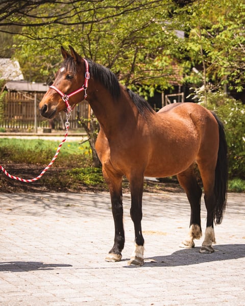The handsome 15-year-old Hungarian Warmblood gelding (approx. 160 cm tall) Luxi has found his way back to us at the horse shelter due to personal circumstances and is now waiting for his very own special person. Luxi is a very uncomplicated, people-oriented, and kind guy who enchants everyone with his beautiful appearance and extremely friendly nature in no time. He is always well-behaved and very patient, loves to discover new things, and enjoys showcasing what he can do during groundwork. Unfortunately, Luxi was diagnosed with Kissing Spines and Spavin some time ago, which makes him unsuitable as a riding horse. However, this cheerful guy is always up for long walks, challenging groundwork, and leisurely carriage rides! At the horse shelter, we are currently working intensively on building up his back muscles – it is important that this continues to be monitored in his new home. Otherwise, Luxi is in excellent health and is open to pretty much any fun. All he needs for his happiness is a horse-experienced person by his side who communicates clearly and without pressure, provides him with security, and guides him through life with loving consistency. He is also very uncomplicated and compatible with other horses, making him the best pasture companion one could wish for. Luxi is rather low-ranking and would prefer an open stable with a small herd or a box with a paddock during the day in his new home.