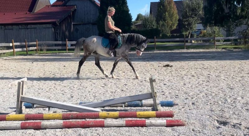 Eyecatcher Sportpony *Wallach *6y *150 cm *gemischte Herde *vorne Beschlagen *2 Blaue Augen *Dressur bis A *Springen angefangen bis 80 cm *Gelände 100% Gruppe und alleine *Box//Paddock//Offenstall gewohnt *Hufschmied und Verladen kein Problem * Videos vorhanden gern per Whatsapp Silver Blue läuft regelmäßig im Schulbetrieb Gruppe sowie Einzel -Unterricht. Verschiedene Reiter gewohnt. Auch als Longenpferd schon aktiv. Verkaufsgrund: Wir reduzieren den Schulbetieb, da der Schulbetrieb in absehbarer Zeit eingestellt wird.