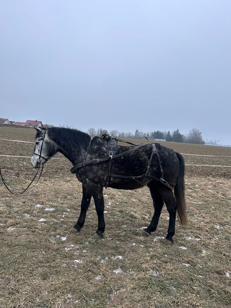 Wir suchen für unseren 7 jährigen witzigen, hübschen und leistungsbereiten Schimmelwallach ein möglichst „für immer“ zu Hause, dass er sich verdient hat. Mit seiner Größe ist er ein ideales Familienpferd oder aufgrund seiner Optik, Coolnes und seinem „Witz“ bestimmt auch für Schowzwecke geeignet. Er ist seit einem Jahr unterm Sattel. Zeitweise auch in vernünftigem Profiberitt. Er kennt viel Bodenarbeit, Platz, Gelände, Verkehr, kleine Sprünge, auch ein Kuschteschirr hatte er schon drauf und will bei seinen Aufgaben immer gefallen. Aufgrund des Ausbildungsstandes nicht für Anfänger geeignet. Später aber bestimmt auch von schwächeren Reitern gut zu reiten. Super bequem zu sitzen, angenehmes Go. Auf Wunsch mit passendem VS Sattel von Cobra. Keine Erkrankungen bekannt. Fitter und robuster Typ. Regelmäßig beim: Schmied (kennt mit und ohne Eisen - brav beim Beschlagen), Osteo, Sattler, TA (Wurmkur und impfen, Zähne Sommer 25) Kennst Offenstall und Box. Ich wünsche mir für ihn aber eine Haltung mit viel Auslauf. (Rang mittel bis hoch) Wenn du denkst das könnte genau zu dir passen, dann melde dich und lerne deinen Traumprinzen kennen. :)