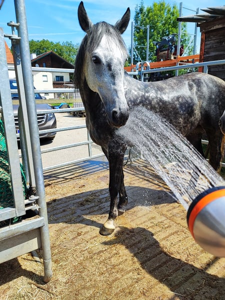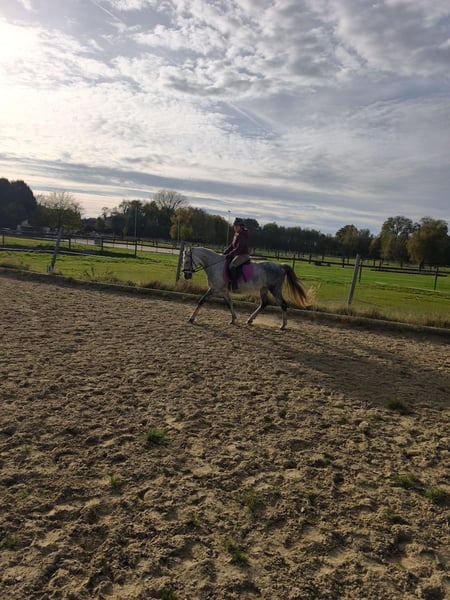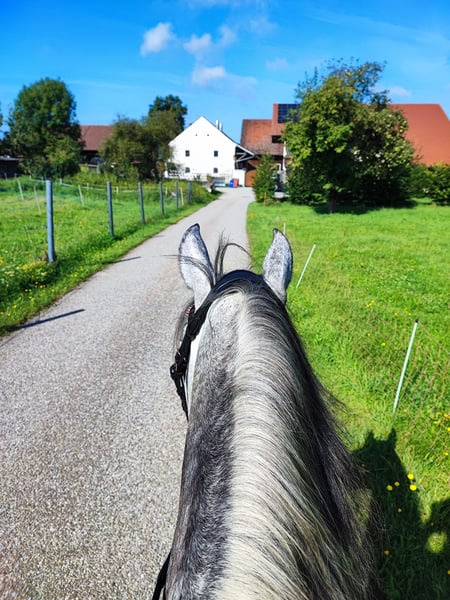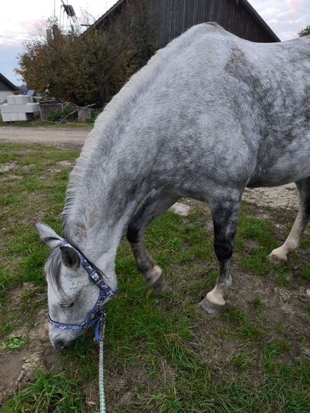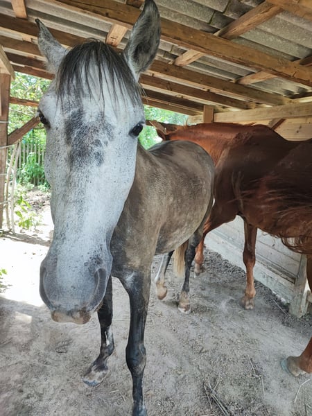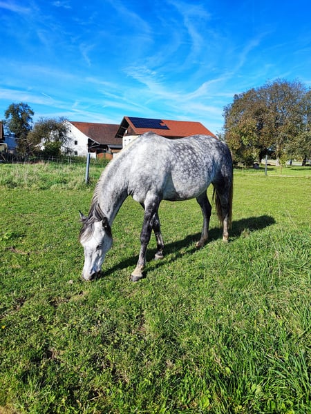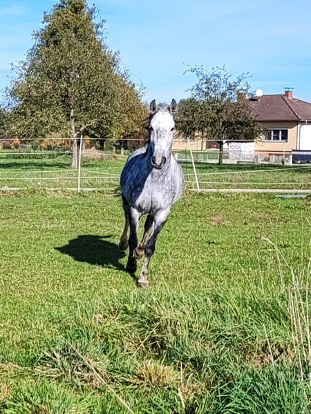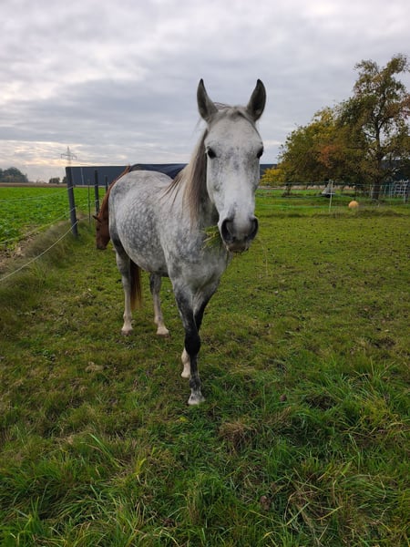Wenn alles passt gebe ich meine 9-jährige Schimmelstute Milla ab. Sie ist im Umgang super brav, schlägt und beißt nicht. In der Herde ist sie eher ranghoch und barhuf unterwegs. Milla wurde die letzten zwei Jahre fast nur in der Gruppe/Zweitpferd im Gelände geritten, hier ist sie in allen drei Gangarten sehr brav. Manchmal etwas guckig, aber nicht schreckhaft. Ist ihr etwas nicht geheuer, bleibt sie stehen und schaut. Sie ist immer händelbar. Alleine waren wir nicht draußen. Auf dem Reitplatz bzw Halle ist sie nicht ganz einfach zu reiten, sie hat hier früher mal schlechte Erfahrungen gemacht und zickt deshalb manchmal oder wird etwas flotter. Sie lernt aber sehr schnell, wenn man sich ausreichend mit ihr beschäftigt. Sie wird nie böse, bockt und steigt nicht. Sie ist generell ein Pferd mit Go, das sich gern bewegt, könnte sie mir gut auf Wanderritten vorstellen. Kein Anfängerpferd! Der Dressursattel, der von der Sattlerin angepasst wurde und ihre Decken wären dabei. Ich suche für sie ein tolles Zuhause, wo man ausreichend Zeit für sie hat.