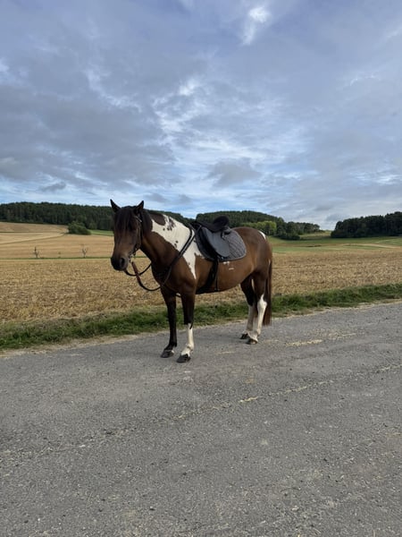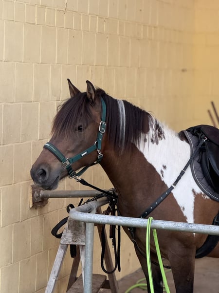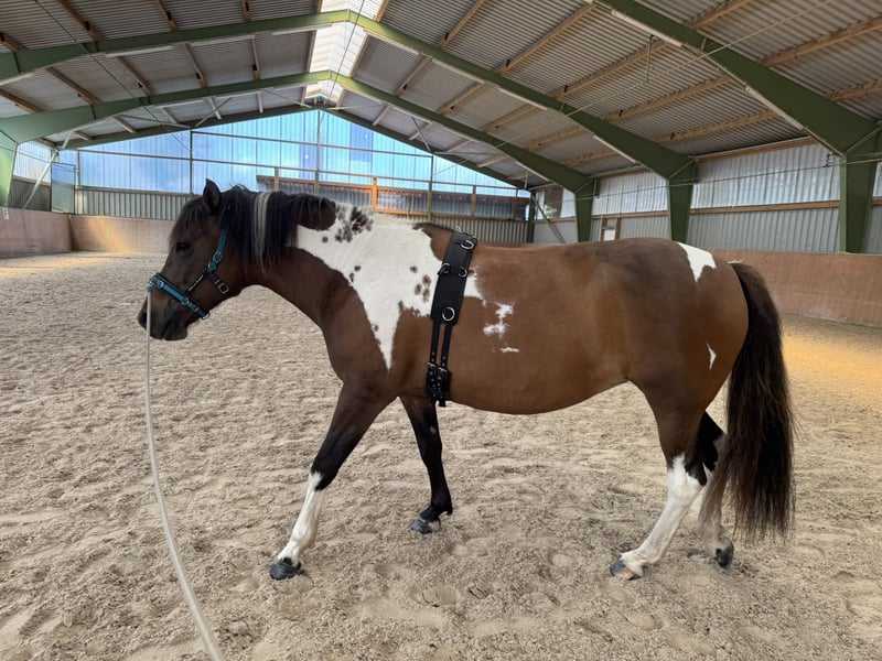 Poezja heißt die 8-jährige reinrassige Huzule-Braunscheckstute mit Abstammungsnachweis, die wir aus Zeitgründen verkaufen möchten. Sie ist in Polen auf einem Huzule Gestüt gezogen, wurde im Alter von 4 Jahren schonend angeritten und sorgfältig mit viel Liebe von einer Horsemanship-Pferdetrainerin, die immer noch regelmäßig mit ihr arbeitet, am Boden ausgebildet. Typisch für die Huzulen hat sie einen starken und eigenwilligen Charakter und braucht einen klaren Menschen, der die Pferdesprache versteht und spricht. Dann ist sie lernbereit und folgsam, was sie vor allem in der Bodenarbeit zeigt. Sie geht in Halle und Platz gut in den drei Grundgangarten, die sehr schön zu sitzen sind, da sie bedingt durch ihr Exterieur eher wenig Schwung in Trab und Galopp hat. Sie ist etwas vorhandlastig, woran man aber gut mit ihr arbeiten kann. Springen ist definitiv nicht ihre Disziplin, das gibt ihr Körperbau einfach nicht her (obgleich sie ein Cavaletti problemlos überspringt). Sie ist sanftmütig im Umgang, zeigt keine Verhaltensauffälligkeiten, lässt sich verladen, hat keine Probleme mit Tierarztbesuchen oder Hufpflege. Sie hat top Hufe und lief bei uns bisher immer völlig problemlos barhurf. Die Hufe sind gesund und extrem widerstandsfähig mit gesundem Strahl und anatomisch korrekter Stellung von Natur aus. Sie hat keine organischen Probleme und hat bei uns noch nie gehustet. Sie hat kein Ekzem und schubbert sich nicht. Da sie zur Gewichtszunahme bei Futter ad libitum neigt, sollte sie hier begrenzt werden. Die Zähne wurde vor kurzem von der Dentistin gemacht und als unauffällig befundet, die Osteopathie kommt alle 6 Monate zum Check (zuletzt im August 2025). Sie ist regelmäßig entwurmt und gegen Tetanus geimpft. Poezja ist kein reines Kinderpony. Wenn sie eine gewisse Führungsschwäche "ihres" Menschen bemerkt, übernimmt sie vor allem im Gelände selbst die Verantwortung, was dann eine gewisse Fluchtbereitschaft erzeugt. Sie folgt dann auch schon mal ihren Impulsen, was ein erfahrener Pferdemensch aber gut in den Griff kriegt. Ein Durchgeher ist sie definitiv nicht, auch bleibt sie nicht einfach stehen. Sie bemüht sich immer um Kooperation, hat jedoch einen starken, rasse- und aufzuchtbedingten Instinkt und sie checkt daher stets ihr Umfeld auf Gefahren hin. Und wie jedes Pferd ist sie nicht gerne alleine, was sie u.U. auch deutlich zeigt. Sie akzeptiert dabei jedoch stets die Umzäunung, ist kein Zaungeher. Sie braucht einen ruhigen, selbstsicheren Erwachsenen mit guter Pferde(sprachen)erfahrung. Ich könnte sie mir jedoch auch gut als Reitschulpony auf einem liebevollen Reiterhof vorstellen, denn sie läuft in bekannter Umgebung und in der Reithalle extrem brav und zuverlässig an der Longe und auch frei unterm Reiter. Sie geht sehr sanft mit Kindern um und zeigt hier keine der gefürchteten "Pony"-Verhaltensweisen wie z.B. Bocken oder absichtliches Streifen der Bande. Mit anderen Pferden geht sie sozial unauffällig um, sie ist gruppenfähig und kann gut sogar im geschlechtergemischten Offenstall gehalten werden. Man kann auch mit ihr züchten (reinrassige Huzule mit Abstammungsnachweis), sie ist aktuell jedoch nicht als Zuchtstute eingetragen. Sie kann noch bis August 2026 bei uns bleiben und (aber nur vor Ort) auch getestet werden vom potentiellen Käufer.