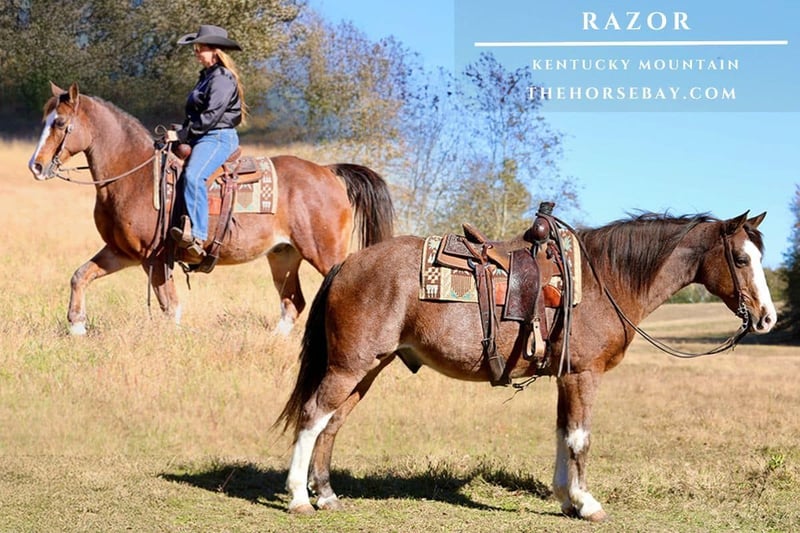 Razor is an 11-year-old Kentucky Mountain Horse gelding. He stands 15 hands tall and has a good, thick build. Razor has that very natural, smooth Kentucky mountain horse gait, which lets you sit and ride all day long. Razor came to us from eastern Kentucky, where he has logged hundreds of trail miles in some of the roughest terrain Kentucky, Virginia, and West Virginia offer. Razor is a horse that most of the family can ride and get along with. He has enough motor to ride those 6-7 hour rides in the mountains, but is also laid back and gentle enough for the more inexperienced riders. You do not have to know much about riding a gaited horse to get along with Razor because he is set in his gait. There is no fancy shoeing or bit required! He stands to mount and dismount. He hauls, shoes, bathes, and stands tied very well. He gets along great with other horses out in the pasture. He’s been on overnight camping trips where he has been tied out on the picket line. We’ve used him to trail ride, ride through cattle, and check fences. He’s been ridden to and through town and out on main highways. Razor will also hook up in a one-horse wagon and drive. He is up to date on Coggins and can be shipped anywhere in the US. We can also hold him at our place for a few weeks after you purchase him, if that’s something you need. Call with any questions or to schedule a visit!