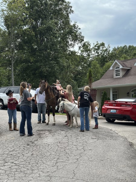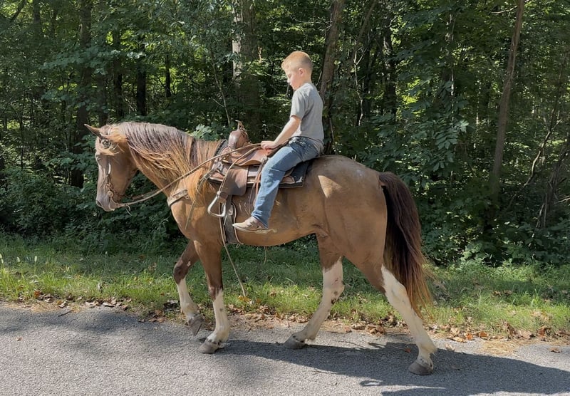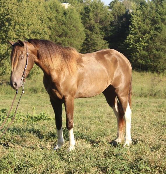 "AVAILABLE ON ONLINE HORSE AUCTION AT www DOT MagicHorseAuction DOT com BIDDING OPEN NOW thru TUESDAY | SEPTEMBER 2ND! - BUY IT NOW AVAILABLE! *Final price will be determined on auction site* CONSIGNOR CONTACT INFO: Dillion Asher 606-308-2414 LOCATION: Mount Vernon, KY "Hey Mufasa!!!! Mufasa is a gorgeous 6 year old 14.2hh Champagne KMSH gelding. He is stunning to look at! With his Fabio hair and unique markings and coloring he is sure to turn everyone’s head! But that isn’t what makes Mufasa so special! He is a real life breathing unicorn or he definitely has been for us. Everyone has absolutely loved him. We have carried him all over riding this spring and summer. He has been rode by everyone in the family and used as a guest horse on a few different occasions. We have ponied horses off him, carried him to some local shows and oh yea drove the tread off our little cart with him. If you didn’t pick up on that he rides and DRIVES!! He doesn’t just half tail drive either this little guy is great! Mufasa is very friendly. Very easy to catch. Meet you at the gate personality. Handles and listens better than most well trained dogs. Loves to be groomed and pampered. Loves a bath and is very easy to clip. Mufasa stands tied anywhere and you will forget about him if that makes sense because he is so quiet you will never hear him. He is also hobble broke as well. Doesn’t move to be saddle, bridled or harnessed. Will stand dead still to be hitched to cart as well and you can hook and unhook him alone. Mufasa stands still to be mounted and will always ride off slow and easy. He is a very laid back guy. Doesn’t get in a big hurry. He is perfectly content will just walking along all day. But he will gait right along when asked. He has a very smooth ground covering running walk that he can really move out and cover a lot of ground. He also has a very smooth canter that he will fall right into out of a walk. Mufasa will ride anywhere in a group. Put him in the very back or in the front he will lead the way or flop along behind. He is really easy. No barn or buddy sour issues. Very confident and isn’t spooky. You can feel safe to carry him anywhere and know that you’re in good hands in any situation. Mufasa is an outstanding trail horse he will go up, down, over or through anything you will ever come too. He is the horse I want to be on when you take a wrong turn and get off the beaten path. He is extremely sure footed and really watches where he places his feet. It will not get too rough for him. He may be more mountain goat than horse. He is 100000% traffic safe and is perfect around farm machinery, atvs, other livestock and wildlife. If you are looking for your next trail partner that’s got it all looks, gait, personality, ability and most importantly brain you better not miss out on Mufasa. We are located in Mount Vernon Ky and can help with shipping if needed. Please feel free to call or text 6063082414 with any questions and set up a time to come out for a test ride and drive. Thanks for looking!