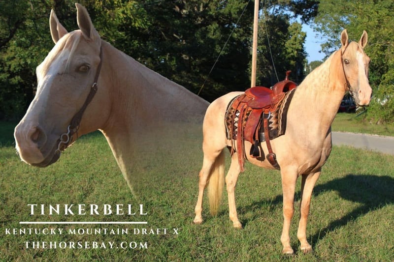 Stunning American Cream Draft/Kentucky Mountain Cross mare, 15.3 hands. This gentle giant is broke for any level rider and has been trail ridden extensively across the US. Perfect for pleasure riding and trail adventures, she has a super sweet and willing temperament! Very eager to please, not spooky, and loves attention. She’s also very patient, making her an ideal choice for beginner riders.