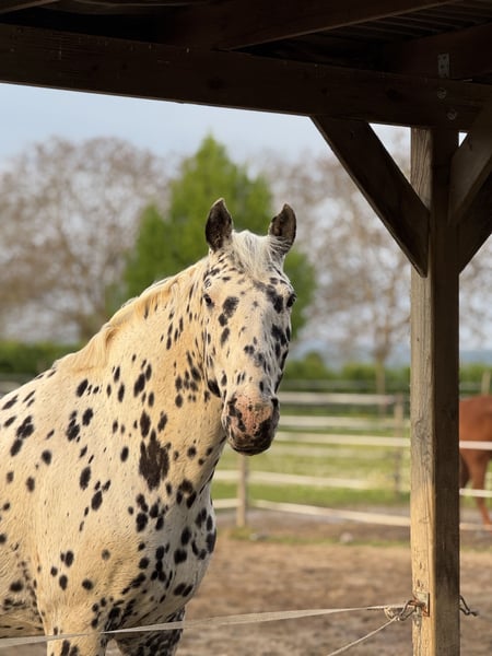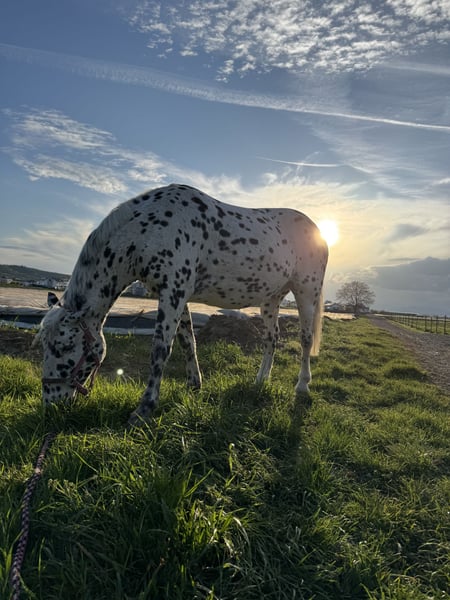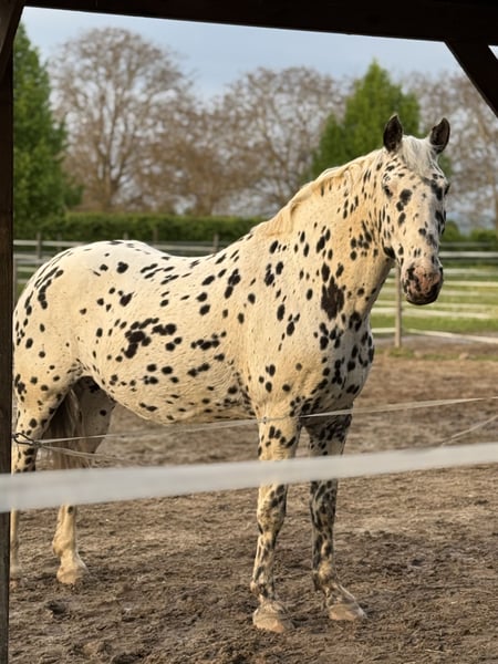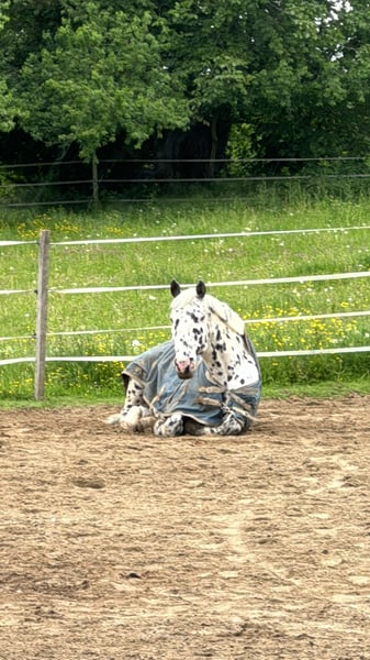 Beautiful Knabstrupper gelding, 13 years old, 16.1 hh, well-handled, seeking a new home. Due to a change in riding activities for health reasons, he is being offered along with all accessories (saddle, bridle, various halters, blankets, hoof boots, etc.). Monti is an absolute sweetheart, extremely honest and well-behaved. Fully confident in the terrain and well-trained. He is compatible with everything — geldings and mares, dogs, children, and all the everyday encounters. Low in the hierarchy, herd-compatible, and unshod. He is looking for a family-oriented home where he will be seen and loved. Due to a mild form of ataxia (narrowing of 2/3 of the cervical vertebrae), which has been present throughout his life, he is not suitable as a sport horse and will not be sold as such. In daily life, he has no restrictions and is otherwise healthy. He is familiar with both terrain and riding arena, groundwork, guided children's riding lessons, and was broken in as a young horse. He has also been driven in a pair as a lead horse (though I no longer drive him). Further information gladly available in person. School riding and commercial dealers are not suitable! Monti will only be placed in the best hands and if the fit is right.