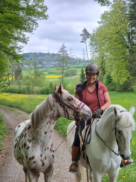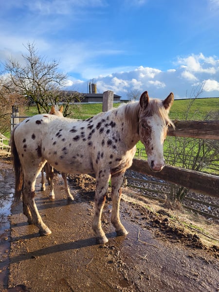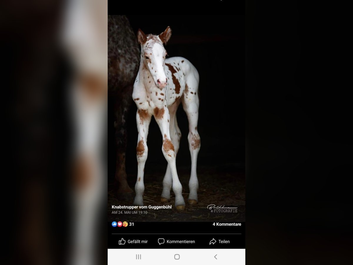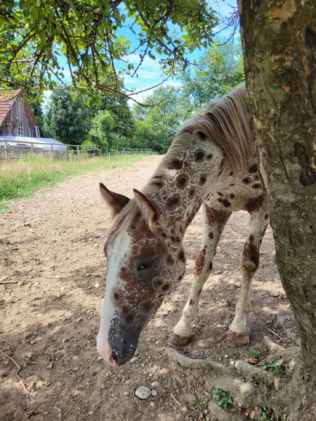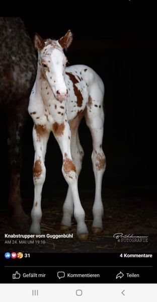 Reingezogener Knabstrupper Fuchstiger, Wallach, geb. Mai 2022 Nachdem wir die Zeit seit Geburt bis jetzt zusammen verbracht haben, er die bestmögliche Kinderstube durchleben durfte, ist der Entscheid gereift diesen Jungwallach weiterziehen zu lassen. Aus der Zucht von Guggenbühl in der Schweiz, Original Knabstrupper. - aufgewachsen im Familienverbund, stets mit Menschenkontakt - ab 6 Monaten bis 2.5-jährig auf der Hengstweide - mit 2.5-jährig Wechsel in den Gruppen-Aktivstall und erste Ausbildungsphase durchlebt: - Spazieren, Handarbeit, Logieren, Gymkhana-Trail, Trense, Sattel, Hufschuhe, Handross-Ausritte, Verladetraining - seit November darf er seine Jugendzeit & weiteres Wachstum auf der Winterweide im Jura geniessen. - Handling, Tierarzt, Zahnarzt, Hufpflege meistert er alles gelassen und souverän. Für ihn wird der weltbeste Platz gesucht. Interessierte Menschen dürfen sich gerne bei mir melden.