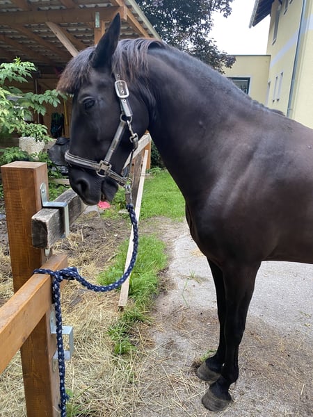Kräftige Rappstute, hervorragende Grundgangarten, Springfreudig.