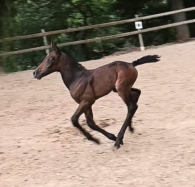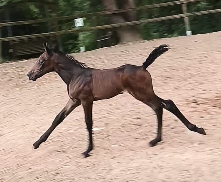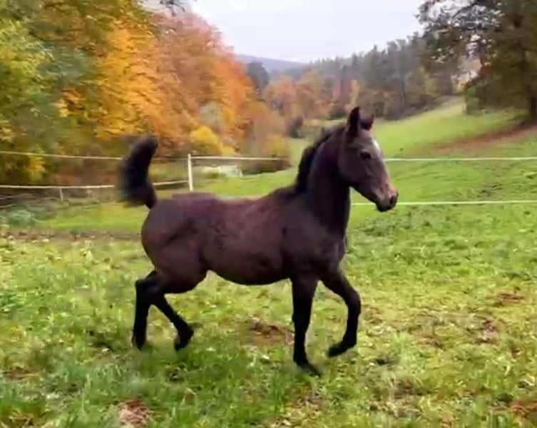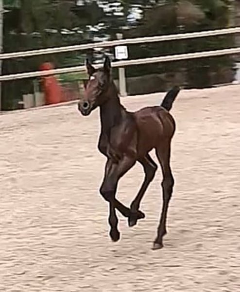 Pa' Dora Diamant af Eichlgütl. Eingetragen beim ZfdP. Vater: Knabstrupper, ZfdP Hengstbuch 2, Benz' Indiana Jones mit alten dänischen Blutlinien, die bis ins 18. Jahrhundert zurück reichen. LP/Lp, PATN1/Patn1. Mutter: Knabstrupper, Pippi, beim ZfdP eingetragen. LP/Lp. Die Farbentwicklung Doras ist noch nicht absehbar. Dora Diamant, benannt nach der letzten Freundin Franz Kafkas, geboren im Kafka-Jahr (17.06.2024) ist ein Stutfohlen mit hoher Menschenbezogenheit und ausgesprochen guten Nerven. Sie geht bereits selbstständig in den Pferdehänger, kennt Baden im Fluss und ist auch sonst völlig unerschrocken. Knabstrupper-typisch hat sie einen sehr klaren Kopf und auch den typischen Eigenwillen. Sie wächst seit ihrer Geburt in einer Herde mit ihrer Mutter (Leitstute) und mehreren anderen jungen Pferden in Offenstallhaltung auf. Aufgrund ihrer Gelassenheit wäre sicherlich auch gut ein Einsatz als Therapiepferd denkbar. Die Eltern haben Beide, insbesondere der Vater eine sehr gute Dressurveranlagung. Der Vater befindet sich im Besitz der Oliveira Stables. Wir bieten darüber hinaus einen sehr günstigen Aufzuchtsplatz (140 Euro pro Monat) an. Bei ehrlichem Interesse bitte gerne Zuschriften mit einer kurzen Vorstellung, wie wir uns die Zukunft von Dora bei Ihnen vorstellen können oder Sie rufen einfach an. Telefon 0177-4816901. Auf dem letzten Foto ist der Vater zu sehen. Die anderen Fotos zeigen Dora von ihrer Geburt bis zum jetzigen Zeitpunkt.
