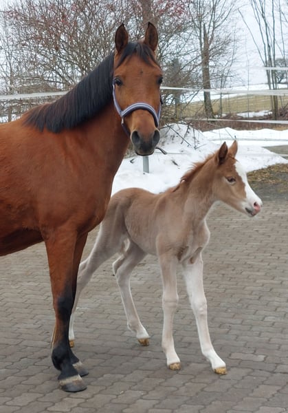 WüPie's LILLIFEE - geb. 07.02.2026 - wird beim ZfdP als Knabstrupper(pony) eingetragen - einfarbig Fuchs - stabiles Modell, ein sehr selbstbewusstes Stutfohlen mit viel Charme und Witz - gut proportioniert mit 3 bestens geregelten GGA, kraftvoll und bewegungs freudig, dabei mit einer elastischen Grundbewegung, die keine Wünsche offen lässt. Aus dem Zuchtjahrgang 2026 bieten wir direkt aus Züchterhand (ZfdP Zuchtstall) ein einfarbiges Knabstrupper Stutfohlen zum Verkauf (kann nach dem Absetzen im August/September ausziehen) in wertschätzende, fördernde und vor allem erfahrene Hände. Geschätztes Endmaß ca um die 140 cm +/-. Unsere LILLIFEE, überzeugt sofort mit ihrer frechen kecken und neugierigen Art und dem dazu passendem liebenswertem Wesen. Sie ist ein stabiler Typ mit viel Go, die man sich später evtl auch gut vor der Kutsche, im gehobenen Freizeitbereich oder kleinerem Sportbereich vorstellen kann. Sie hat ein wunderbar feines Gesicht und bewahrt immer einen klaren Kopf, egal in welcher neuen Situation. Sie überzeugt mit ihrer Neugier, gepaart mit dem richtigen Temperament, ihrem Auftreten und Präsenz, vor allem aber ihrem freundlichen und ehrlichen Wesen wenn sie einen mit einem freudigen Wiehern begrüßt und sich auf ihre Krauleinheiten freut. Sie ist total Menschen bezogen und wächst bei uns mit Familienanschluss auf, total lieb und lässt sich liebend gern putzen. Hufe heben, auskratzen oder gar beim Hufschmied gibt es überhaupt keine Probleme. Halfter kennt sie mittlerweile und wird bis zu Abgabe natürlich gut zu führen sein. Außerdem bekommt sie mehrfach Mineralien/Vitamine verabreicht die Fohlen benötigen u.wird entwurmt. Unsere junge Dame bringt Vieles mit, um später Spaß und Erfolg im gehobenen Freizeitsport od. kl. Sportbereich zu haben. Das perfekte Kinder und Familienpony, auch für kleinere Erwachsene gut geeignet. Ihre Mutter LOUISE - beim ZfdP mit 7er und 8er Noten eingetragen - eine braune Reitponystute (o.A) mit ca 140 cm. Ihr Bewegungsablauf ist taktvoll, geregelt und raumgreifend. Sie ist eine aufgeweckte, anständige und treue Stute mit einem wunderbarem Charakter, ehrl. u. liebenswert. Ihren klaren Kopf und einwandfreien Charakter bewies sie schon in jungen Jahren, als sie noch Anfänger Kindern und Jugendlichen das Reiten lernte. Ebenso ging sie brav bei Umritten mit, lässt sich dabei immer problemlos verladen und händeln. Mit ihr hat man sowohl auf dem Platz/i.d Halle od. im Gelände Spass. Diese vielseitige Veranlagung gibt sie stets an ihre Fohlen weiter. All ihre Fohlen sind bisher immer als Prämienfohlen eingetragen worden und bereiten ihren Familien viel Freude in den unterschiedlichsten Sparten. Der Vater 'VIRGIL AF DUTTERUP' ist unser eigener KnabstrupperPony LeistungsHengst, geb.08.04.09, Braun-Tigerschecke, 139cm > V: Timon af Lille Hav > MV: Sokrates af Mesballe Gekört ist er in Dänemark beim KNN, Leistungshengst - HLP 2Tages Kurzprfg.in Ansbach 2014 *** Auf der Intern. Ponyschau des Ponyzuchtverbandes Ndb/Opf 2024 konnte 'VIRGIL' den Titel 'Gesamtreservesieger' mit nach Hause nehmen, zusätzl. wurde er beim ZfdP Championat Ba-Wü 2024 als würdiger Vertreter seiner Rasse prämiert. *** Dieser Hengst besticht mit seiner auffallenden Optik in Rasse typischer Tigerscheckung und einem starken Fundament. Sein Schritt ist stets fleißig mit Raumgriff, sein Trab ist mit leichter Knieaktion und Schwung ausgestattet, die Galoppade ist immer energisch, dynamisch durchgesprungen. Am Sprung im Freispringen behält er die Übersicht, überzeugt mit einem enormem Springvermögen und ist immer fleißig mit Freude bei der Arbeit. Sein ausgeglichenes Temperament, seine Freundlichkeit und ein klarer Kopf machen ihn zum zuverlässigen, coolen und charmanten Partner im Alltag und für die ganze Familie. Er ist sehr Menschen bezogen, achtet vorsichtig auf Kinder, möchte immer gefallen und sein ausgezeichneter Charakter macht ihn im Umgang unkompliziert und liebenswert. ° Sporliche Erfolge 2025 von VIRGIL AF DUTTERUP ° : - Sieger im Freilauf und Freispringwettbewerb mit je über 8,5 beim ZfdP Freilauf/Freispringcup Niedersachsen - Zweit platziert im Freispringwettbewerb mit wieder 8er Noten beim ZfdP Freispringcup in Schleswig-Holstein - Klassensiegerhengst auf der Internat. Ponyschau 2025 WüPie's LILLIFEE (und beide Elternteile) können natürlich gerne bei uns 'WüPie - Pferdezucht' in Oberfranken, Standort 95119, besichtigt werden. *Aus dieser Anpaarung vom letzten Jahrgang, wurde die Vollschwester 2025 als Sieger & Championatsfohlen ausgezeichnet* >> also sichern Sie sich jetzt schon rechtzeitig ein tolles und einzigartiges Familienpony zum super Preis, bevor dieser mit kommenden Vorstellungen auf Schauen und nach der Eintragung steigt ! Bei Interesse, Fragen od Terminvereinbarung zur Besichtigung schreiben Sie uns gerne an - 0176/21174148 für WhatsApp, wir freuen uns auf Sie.
