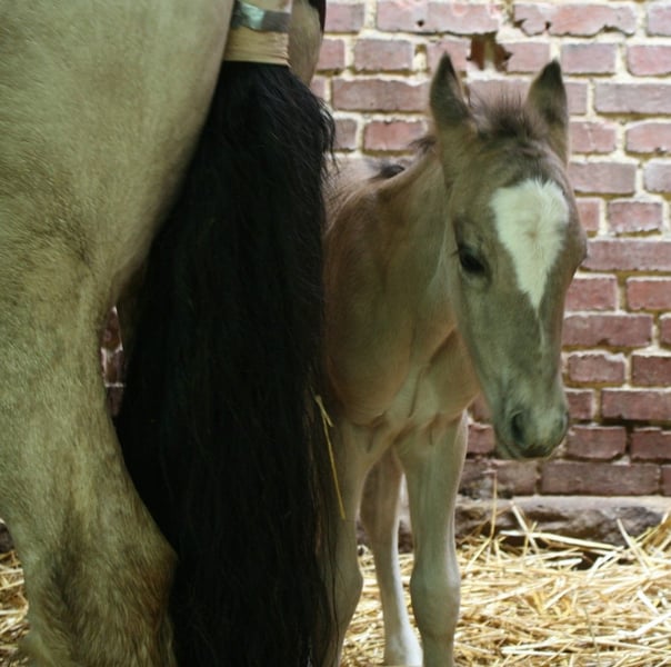 Grisu, a beautiful dark Grullo, is looking for a new owner. Born in May 2024, currently 1.37 m tall, with a powerful build behind and a height of approximately 1.45 m (possibly a bit more) in the Haffiform. Square and well-proportioned, compact, suitable for adult riders in the future. Elegant head, lovely neck crest, very good topline, two-tone mane and tail. His name is Grisu. His mother is a Tinker (1.45 m) crossed with a Konik (147 cm). He is healthy and robust, with excellent hooves. He is used to being turned out alone, remains calm on his own, and is familiar with loading and trailer driving. Very manageable for children and beginners, totally cool and fearless, human-oriented, and learns very quickly. He already knows a lot, including desensitization training, walking in the terrain and on the road. He is gentle when being farriered and comes to call in the herd. There is a possibility that he might be gelded by our veterinarian. Currently, he is housed in a large box with his buddy and is also kept among our mares in the stable. He is a reliable pony suitable for riding and driving. Additionally, he is in one of the most beautiful rare colors, Grullo / Mouse Dun, with zebra stripes on his legs, black-rimmed ears, and a dark dorsal stripe. Photos from foal age included; more recent pictures to follow.