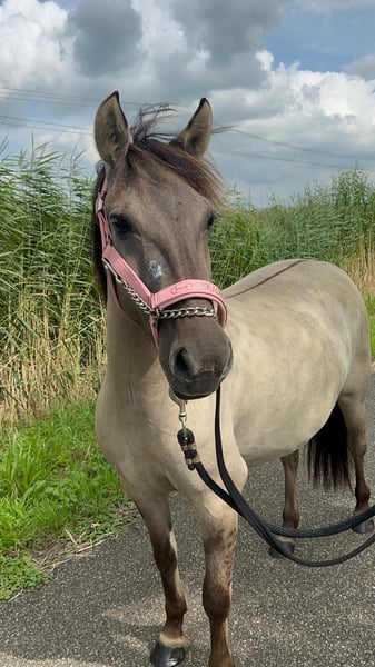 Coconut, also known as Coco or Koekie, is looking for a 5-star home where she can continue to grow. Coco is ready to make someone very happy. I would love to see her go to a family or individual who truly has their eyes on her. She does need someone with experience in young horses. Coco is a 2.5-year-old mare, turning 3 in April. She is a Konik mare who is very sweet but can sometimes be a bit unsure. However, she is definitely a sensible pony. When Coco feels uncertain, she tends to show it by standing still or sticking close to you / walking in your pace. She has never misbehaved with me, such as bucking or similar. Coco is very gentle with children, accustomed to dogs, traffic-proof, but she can still be startled by loud noises (which is understandable, as she is still quite young). I would love for Coco to go to someone who can give her plenty of time outdoors and lots of attention—she absolutely loves it! Coco is already used to a bridle, enjoys groundwork, and is occasionally lunged. She really enjoys walks. She has had a saddle on before and didn’t show any resistance. Recently, Coco visited the dentist and her wolf teeth were removed. She has been dewormed recently, and her vaccinations are complete and always up to date. The farrier will visit again on December 1st, so her hooves will be well maintained. She has been clipped (hunter pattern) and is currently under a blanket. She is on hay 24/7 and is used to being outside around the clock, but being stabled in the evening is no problem for her. Coco is social with other horses and is a real all-rounder 🥰 Coco is easy-going and only goes to a good home. She has no faults. She is not officially measured, but the estimate is around 13.3 hh. She can be seen in Oud-Alblas. For videos, please send a private message. Please note: Coco finds trailer loading a bit challenging!
