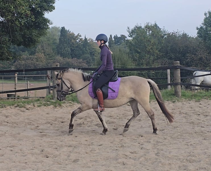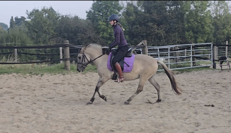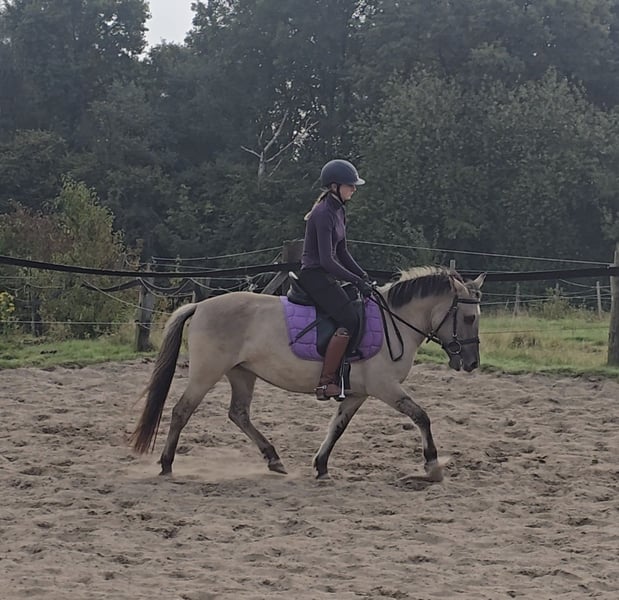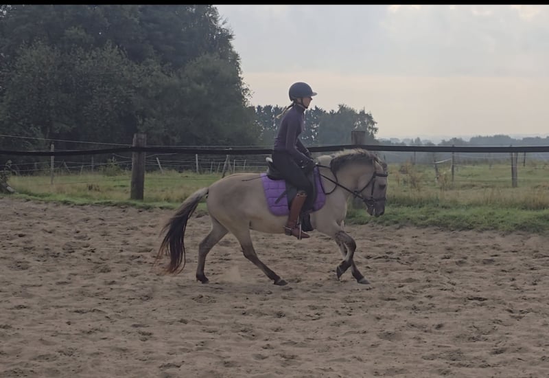 Please schedule an appointment at: +49 155 61855942 Feel free to contact via WhatsApp as well. Location: 45472 Mülheim Cinderella is a 3.5-year-old, approximately 1.28 m tall Connemara cross mare. Cindy is well-behaved, sensitive, and a gentle soul. She has shown good manners for her age and handles everything well. She has now been backed and is doing a fantastic job, making her suitable as a future children's pony. Of course, she still requires some fine-tuning here and there. However, she responds immediately, yields when asked, and listens attentively. Cindy is very rhythmic and eager to learn. She rides quietly on the bit and requires relatively little effort to ride. With further training, we can imagine her as a wonderful children's pony. The rider is 1.75 m tall, so she comfortably covers an adult rider and can be ridden by someone of any size. Cindy is barefoot, friendly, and enjoys cuddling. A veterinary examination (AKU) can be arranged at the buyer's request. To help reduce horse tourism, we charge €30 for the presentation and inspection of the horse. This fee also benefits the horses through osteopathy, veterinary care, chiropractic treatments, massages, solarium, muesli, carrots, and other care.