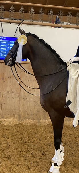 Franzi currently has over 20 placements in S* and S** competitions with 71%, as well as several victories and placements in dressage at S level with up to 75%. He has already shown piaffe on the ground. In the large arena, he makes a good impression and can impress with his presence, plus he has enough potential for more. Since he was four years old, he has been ridden and trained by the same amateur rider, and he has never been sick or lame; current X-rays are available with no findings. When out riding, he is very well-behaved, whether in a group or alone. At home, he has jumped at A level, although this has not been further developed. He is very motivated and intelligent, very light to ride, and he is very sensitive, which means he is not always easy and needs a rider who can provide him with a lot of security. He is not a beginner's horse and is not suitable for nervous riders. Unfortunately, the current rider cannot fully utilize the potential of this highly talented horse due to her studies, which is why he will be reluctantly offered for sale.