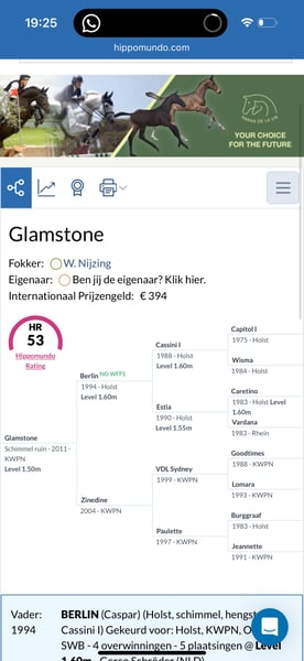 Glamstone is a 2012 sport horse with proven experience up to 1.50m level and beautiful results in the bigger classes. He combines scope & quality with a very honest character. He has successfully competed at 1.50m level and at the same time has also been ridden by a young girl in 1.10m classes and up to 1.30m in training. This shows his versatility and good rideability. Glamstone is a sensitive horse with a big heart. He gives everything for his rider and always jumps. In the right hands, he is a competitive partner for ambitious juniors, young riders or amateurs wanting to step up to higher levels. He is healthy, correct and ready for his next chapter. We are looking for the right match rather than just a quick sale. A 5⭐ home is a must. 📍 Located in Belgium 📩 Serious inquiries only – more videos available on request.