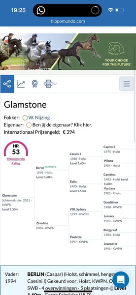 Experienced 1.50m Showjumper with a Golden Heart Glamstone is a 2011-born showjumping gelding with proven experience up to 1.50m level and consistent, beautiful results throughout his career. He combines scope, carefulness and quality. He has successfully competed at international level and also compete 1.10/1.20m classes with a young girl (11y), proving his versatility and kind mindset. Glamstone is a horse with a golden heart. At home he has seen everything and is very experienced in daily handling. He can be a bit sensitive and alert in the stable environment, but he is always well-behaved and correct. He is not naughty, simply a horse with blood who is aware of his surroundings. In the arena and especially in the course, he is completely focused on his job. He switches into full competition mode, stays concentrated from start to finish and always gives his rider his best effort. He has competition mileage, knows his job, and is suitable for a confident junior, young rider or ambitious amateur who wants to compete at a higher level with an experienced partner. He is healthy, fit and ready to continue his career. Reason of sale; Glamstone is offered for sale due to the rider’s injury and because we currently have too many horses in the stable. Serious inquiries only. No bargain hunters and no time-wasters, please. For more information and videos, please feel free to contact us +32474767424