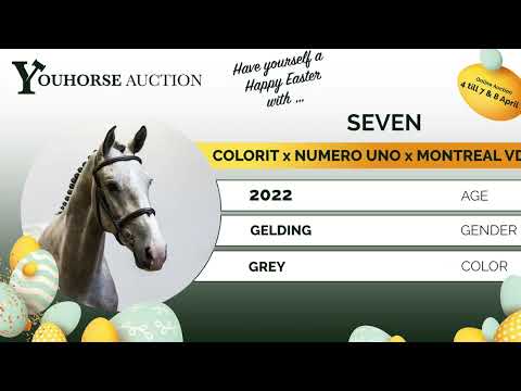 De vierjarige Seven is een paard dat voor meerdere disciplines geschikt lijkt. Hij is nu ongeveer 6 maanden onder het zadel en viel direct op door zijn inzet en werkwilligheid. Opvallend is dat hij al galopwissels laat zien onder het zadel. Seven is een paard met een fijne instelling, leert snel en pakt het werk makkelijk op. De video in de veiling is van oktober, de thuisvideo is recent en laat zijn huidige niveau zien. Vader Colorit (1.60m) is een zoon van Coriano (1.60m) en behoort tot de betere verervers, met nakomelingen op internationaal niveau zoals Carlson 86 (1.60m) en Concordia 49 (1.60m). Moeder Nummer One is een dochter van Numero Uno (1.55m), die bekend staat om het doorgeven van vermogen en instelling. Tweede moeder Bieke (v. Montreal VDL 1.60m) bracht onder andere Hakini (1.50m) en meerdere paarden op 1.30m–1.35m niveau. Verder komt uit deze stam meerdere 1.60m-paarden zoals Liberty, Ocana en Audi’s Candlelight, wat de hardheid en sportkwaliteit van de lijn bevestigt.