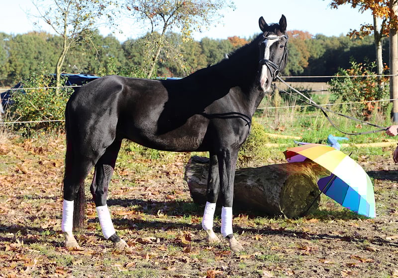 For sale: an impressive KWPN gelding – the perfect partner for dressage! This elegant black stallion was born in 2021 and impresses with his striking appearance and promising temperament. Standing at 16.1 hh, he offers an ideal size for ambitious riders seeking a reliable partner in the dressage arena. The gelding demonstrates solid basic training, a friendly nature, and a willingness to learn. He shows great potential for further development in dressage and is suitable for both advanced riders and talented young riders. Revel is offered at a significantly reduced price due to a head injury. If you are interested or have further questions, please feel free to contact me. Arrange a viewing appointment and see for yourself this promising horse! Additional information gladly available via WhatsApp at 01722734811.