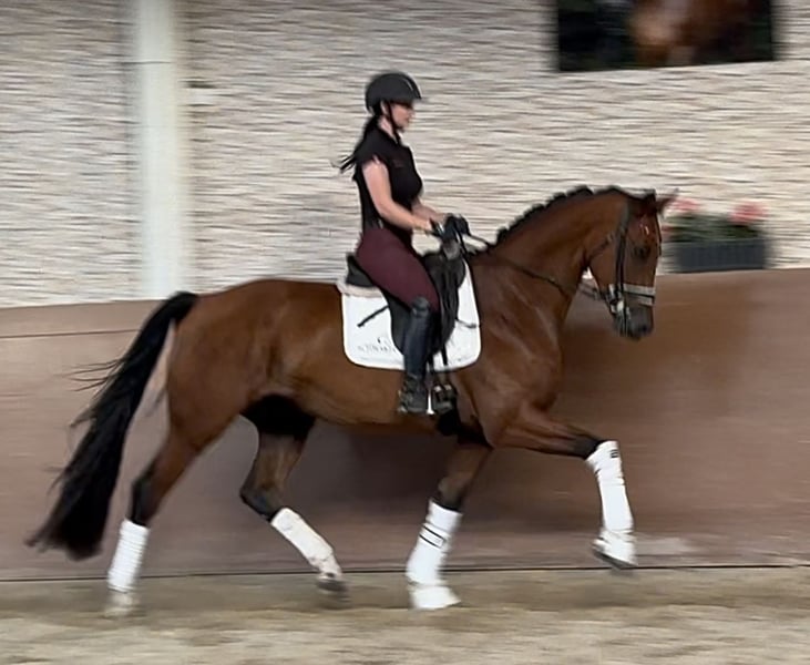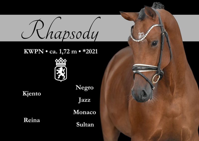 Dear Interested Parties, For appointment arrangements for trial rides, please send me a WhatsApp message. For further questions, I am available via WhatsApp during the day, and you can reach me by phone best between 4 PM and 7 PM. I look forward to hearing from you. www.angelina-devittorio.de ⭐️Rhapsody⭐️ Age: 4 years (2021) Height: approx. 1.71 m Pedigree: Kjento x Monaco Training Level: Dressage Horse A, highly placed Vet Check: Good X-ray images available For sale is a large-framed, four-year-old gelding by Kjento, who impresses with very good movement quality in all three basic gaits. Due to his physical development, he has been deliberately trained slowly and in a horse-friendly manner so far. Now fully matured, he was able to secure second place in his first dressage horse test of class A right away. His canter is characterized by an excellent, uphill jumping mechanism, while in the trot he presents himself as elastic, loose in the footfall, and energetic, and in the walk, he impresses with clarity in rhythm and good reach. He always shows himself to be cooperative, fearless, and clear-headed. Despite his absolute suitability for amateurs, his current training level still requires some young horse experience from the rider. His brother Elegance is highly successful in Grand Prix sport under Beatriz Ferrer Salat. Here grows a training horse of exceptional quality that possesses all the prerequisites for a successful career in the big arena.