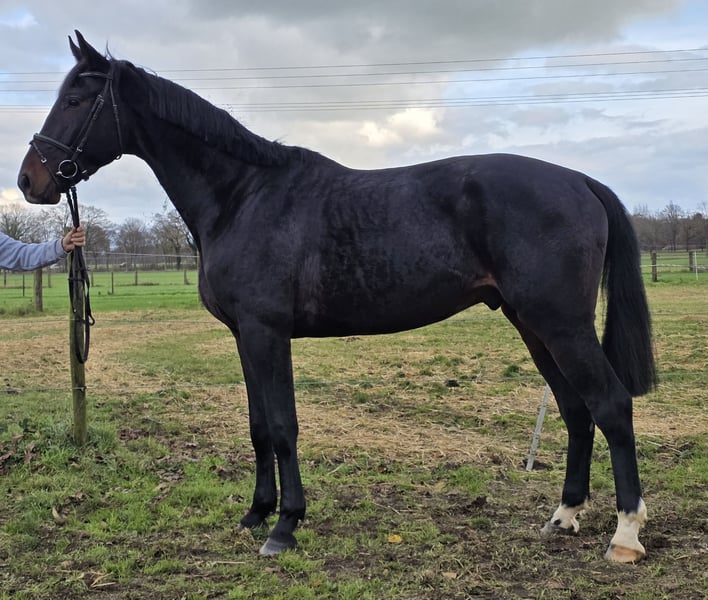 Stich is a loyal, currently 17.5 hh KWPN gelding. He descends from renowned bloodlines including Jameson RS2, Blue Horse Zack, Atilinda M/Waleska, Weltruhm, Dawina, and Weltmeyer. His pedigree is world-class; normally, such a horse would be quite expensive. :-) Stich truly possesses a lot of quality. Now for the caveats!!! Stich has two minor issues. Firstly, he suffers from shivering, and secondly, he has a slight laryngeal tie-back. However, he copes well with both conditions. We believe that a horse with such qualities deserves a chance. Stich has now been under saddle ten times. He has been gentle and cooperative with everything so far. He is simply a big, gentle giant. He is already working in all three gaits under saddle, with videos available. We see him as an excellent leisure horse, although we also know some horses with shivering competing successfully at higher levels. If you are interested in Stich, we look forward to your call at: 0177/2721831.