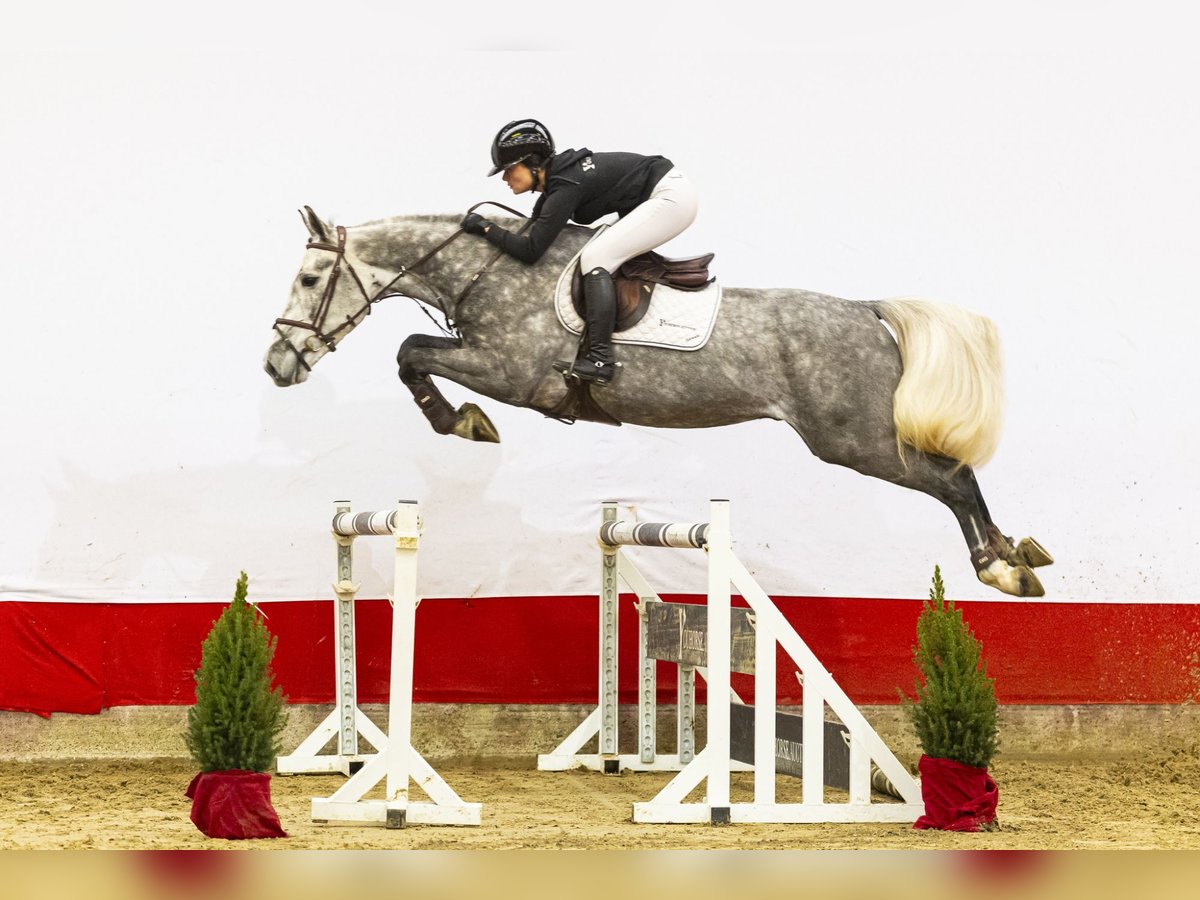 Rapido immediately caught the eye upon arrival. A beautifully conformed grey with a commanding presence. A true Nixon son with bloodlines, exactly the type we like to see: quick off the ground, with plenty of scope and an excellent attitude. He is suitable for both amateur and professional riders. Having already completed his first show jumping courses, he clearly demonstrates commitment and willingness to work. He is very easy to ride, which is a benefit of a correctly built horse. Additionally, he has a very good character. Not only an eye-catcher but also a pleasant horse to ride and work with on a daily basis. Anyone who purchases this horse will truly enjoy him. Sire Sire Nixon van ’t Meulenhof competed at 1.60m Grand Prix level and is a proven top sire. As a son of Denzel van ’t Meulenhof and out of the renowned Narcotique de Muze IV line (Carthago), he is known for passing on scope, mentality, and quick reflexes. His offspring perform at the highest international level. Dam and Damline Dam Perlina W (Mr. Blue) competed at 1.40m level and holds Elite, sport (spr), and PROK titles. She has produced several sport horses, including: - Uranus W (Hornet Rose x Mr. Blue) – 1.30m - Dumoulin Z (Diarado x Mr. Blue) – 1.30m - Larina (Homerun x Mr. Blue) – 1.30m - Joint Venture Z (Xander van de Zeshoek x Mr. Blue) – 1.30m Granddam Gerlina (Pele x Farn) is a ster and prestatie mare, producing, among others: - Blue Devil (Mr. Blue) – 1.50m - Perlina W (Mr. Blue) – 1.40m Great-granddam Oberlina (Farn x Balthazar) is keur, preferent, and prestatie, forming the foundation of an exceptional sport family. This line has produced numerous top-level horses, including: - Olympic Andretti T (Ramiro Z) – 1.60m - Kastello (Concorde) – 1.60m, KWPN-licensed stallion - Kwiddanta van de Laarse Heide (Quidam de Revel) – 1.60m - Rambo (Concorde) – 1.60m A highly proven damline with multiple international 1.60m horses and approved stallions.