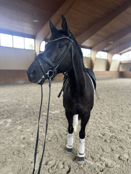 Goldi“ – ein 1,70 m großer, bildschöner Rappwallach mit sehr guten Grundgangarten – sucht ein neues, passendes Zuhause. Er ist ein ausgesprochen liebenswerter, sanfter Charakter, absolut brav im täglichen Umgang, Schmiede - und Verladefromm und ein Pferd, welches einen schnell in seinen Bann zieht. Für den klassischen Sport ist Goldi leider nicht optimal geeignet. Er zeigt sich unter dem Sattel phasenweise gestresst, sodass die sportliche Ausbildung für ihn mental eine Belastung darstellt. Wir haben das Gefühl, dass er bei einer festen Bezugsperson, die ihm Zeit, Ruhe und Zuwendung schenkt, aufblühen würde. Goldi braucht jemanden, der ihn an die Hand nimmt, ihm Sicherheit gibt und ihm ein echtes Endzuhause bieten möchte. Kein Steigen, kein bocken! Näheres gerne per Telefon. AKU mit Befund. Für jemanden, der ein freundliches, anhängliches Pferd sucht und Freude daran hat, einem tollen Typen einen schönen Lebensplatz zu schenken, ist Goldi ein wunderbarer Partner. Wichtig: Platz vor Preis. Uns und seinen Besitzern ist ein gutes, langfristiges Zuhause das Allerwichtigste. Weitere Infos, Bilder oder Videos senden wir gern auf Anfrage zu.