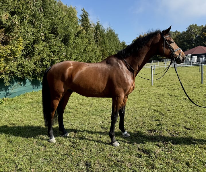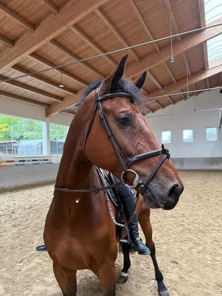 For sale is a beautiful 6-year-old gelding, who impresses with his very good basic gaits as well as his jumping ability. This talented gelding shows motivation, willingness to learn, and rideability in daily training. He has a pleasant temperament and is a joy to ride, with a light contact and a lot of presence. An ideal horse for riders looking for a talented young horse for show jumping or eventing – with enough quality for higher levels as well.
