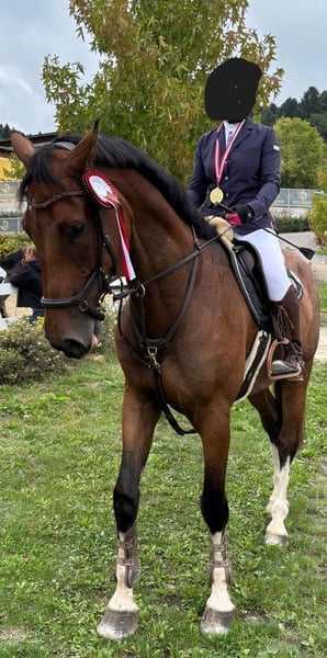 Puledro castrone di 6 anni con grande potenziale, disponibile a causa di mancanza di tempo. Ha vinto subito alla sua prima gara. Adatto anche per dilettanti. È molto tranquillo sotto la sella e salta tutto senza esitazioni. Durante le uscite in campagna può essere un po' timoroso, ma si lascia convincere facilmente.