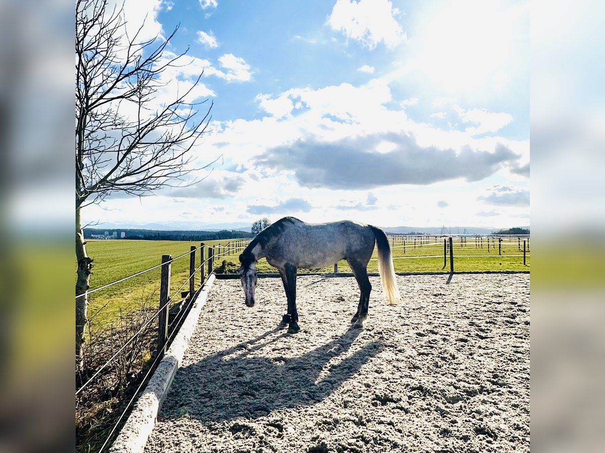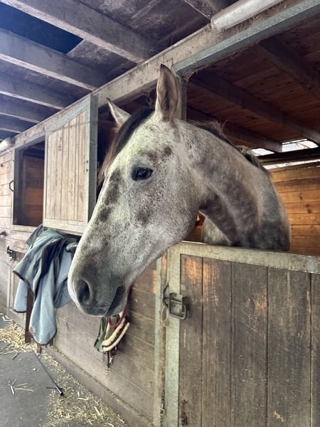 Promise, vielversprechender KWPN-Wallach, geboren im Jahr 2020. Dieser elegante Apfelschimmel beeindruckt durch seine beeindruckende Größe von 175 cm und seine elegantes Erscheinungsbild. Mit seinem modernen, sportlichen Aufbau und seinem ausgeglichenen Temperament für sein Junges alter, ist er ein zuverlässiger Partner für ambitionierte Reiter, die auf der Suche nach einem talentierten Nachwuchspferd sind zum noch selbst fertig auszubilden. Promise ist sehr arbeitswillig, Intelligent und Menschenbezogen. Wir suchen für ihn nur ein zuhause, weil er leider noch am Anfang von seiner Ausbildung steht und meine Tochter noch nicht so weit ist für ihn. Promise zeigt einen Hahnentritt im Schritt, was ihn aber nicht in der Arbeit einschränkt. Am besten macht man sich selbst ein Bild und kommt vorbei ihn besuchen. Gerne erzähle ich mehr bei Interesse.