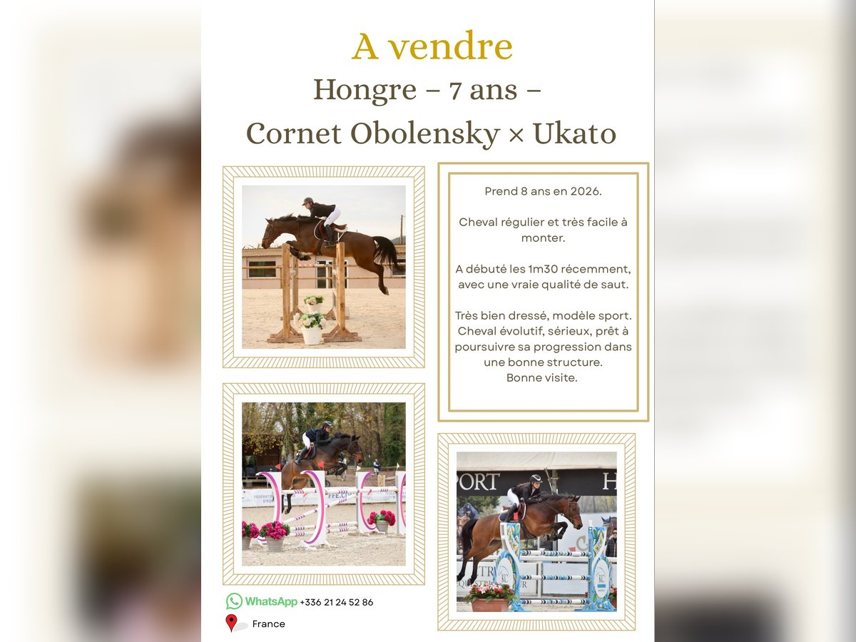 Prend 8 ans en 2026. Cheval régulier et très facile à monter. A débuté les 1m30 récemment, avec une vraie qualité de saut. Très bien dressé, modèle sport. Cheval évolutif, sérieux, prêt à poursuivre sa progression dans une bonne structure. Bonne visite.