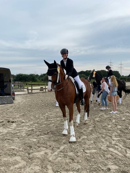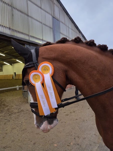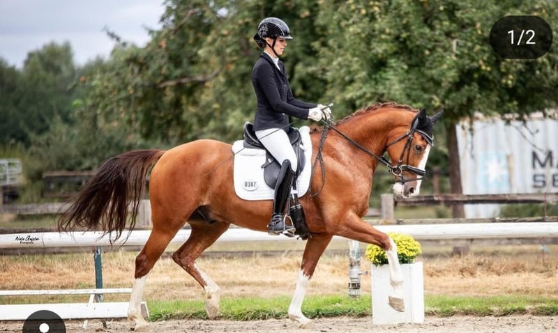 Chelo ist ein 9 jähriger, ca. 167cm großer Wallach. Er ist in diesem Jahr auf M Niveau vorgestellt worden und konnte sich in dieser Klasse gut platzieren und diese auch gewinnen. Er läuft allein und auch in der Abteilung brav durchs Viereck. Chelo hat drei sehr gute GGA wobei der Schritt und der Galopp überdurchschnittlich zu bewerten sind. Er ist lieb im Umgang, herdenverträglich und ein verlässlicher Partner im Dressurviereck.