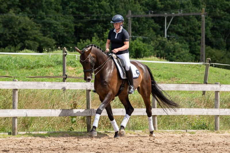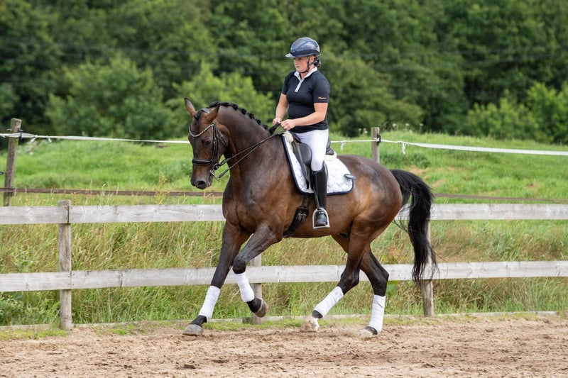 Aufgrund eines Umzugs zum Verkauf angeboten. Lyon ist ein liebenswerter und eleganter 9-jähriger Rapphengst des Apache x Dayano. In den letzten 2,5 Jahren wurde Lyon von einer GP-Reiterin ausgebildet, wodurch alle Übungen sehr korrekt erlernt wurden. Er ist auf dem Niveau Z2+1 eingestuft. Die fliegenden Wechsel sind bereits bestätigt. Er zeigt eine grüne Pirouette und eine Serie. Bevorzugt wird ein sicherer Reiter, der ihn ruhig behandelt und sich Zeit für ein entspanntes Aufwärmen nimmt. Er ist ein lernwilliges und ehrliches Pferd. Seine Impfungen, Wurmkuren, Hufschmied, Zahnarzt- und Physiotherapie-Behandlungen werden regelmäßig dokumentiert. Das Pferd ist klinisch bis Oktober 2025 abgenommen. Lyon weist eine leichte Verknöcherung des Hufknorpels am rechten Vorderbein auf, die jedoch keine Beeinträchtigung darstellt. Lyon ist an die Waschbox gewöhnt, verhält sich brav in der Box, kann problemlos mit mehreren Pferden auf der Weide stehen, ist artig auf fremdem Gelände und bei Ausritten und frei von Boxenfehlern. Er steht am liebsten frei auf dem Anhänger für eine reibungslose Fahrt. Weitere Untersuchungen sind nach Absprache möglich, keine Kostenbeteiligung. Der Preis inklusive Trense, Decken und Satteldecken. Weitere Infos: +49 611 860760