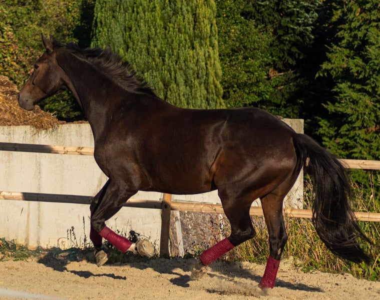 Caballo de doma / de volteo Yegua de 9 años, 1,73 m, con excelentes habilidades en la doma clásica. Se desplaza tranquilamente por el campo (¡incluso cerca de vacas!), es muy buena en trabajo en tierra (puede ser envuelta en una lona) y ¡le encanta acurrucarse! Es tranquila en la herrería y en el remolque, y muy dócil en su manejo. Conoce el pasto todo el día con otros caballos, pero también ha estado en la pradera con una yegua. La propietaria ya no puede montar tras un accidente. Ubicación: 51491 14.5 🥕