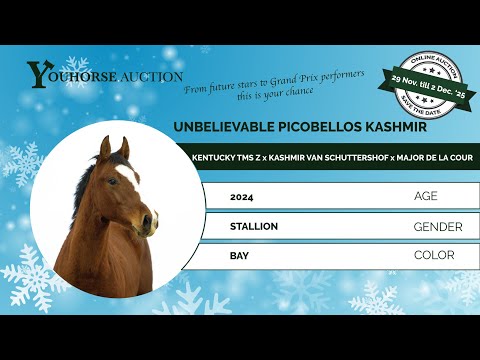 De jaarlinghengst Unbelievable Picobellos Kashmir weet hoe je moet springen. Hij ontwikkelt veel afdruk, toont een goede achterhandtechniek en wil geen foutje maken. De negenjarige Kentucky TMS Z is een AES- en KWPN-goedgekeurde zoon van Kannan. Vorig jaar debuteerde hij in de 1.55m Grote Prijs op Outdoor Gelderland, goed voor een tiende prijs met Maikel van der Vleuten. Moeder Damira (Kashmir Van Schuttershof) heeft 1.50m parcoursen gesprongen met Sven Van Dijck (BEL). Grootmoeder Tiquilla van den Berg (Major de la Cour x Heartbreaker) sprong zelfs op 1.60m niveau met Dirk Demeersman. Deze Tiquilla bracht ook Chelana Z (1.60m Grand Prix) en een 1.35m springmerrie.