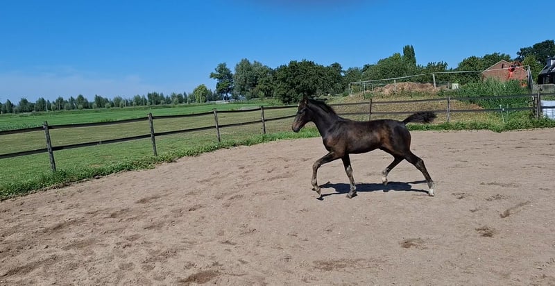 À vendre : Poulain entier (né le 22/5) de Denver U.S. x Just Wimphof. Poulain très affectueux et orienté vers l'humain, avec beaucoup de taille et de bonnes allures. Il se déplace en montée avec beaucoup de prestance et une belle technique de jambes. De cette lignée maternelle proviennent plusieurs bons chevaux de sport, ainsi que le G.G.H United. Le poulain est correctement construit et en parfaite santé. Récemment, il a reçu le label D-OC.