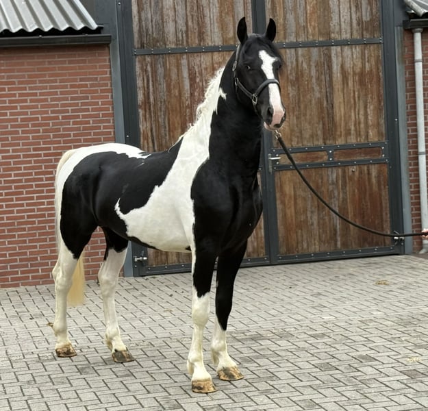 Strikingly beautiful 3.5-year-old black and white stallion. He is super beautiful in his piebald coloring. He is a true showstopper. With a lot of presence and a fantastic leg technique, he moves through the arena. He has full KWPN papers. If interested, please call or message: +31643197337
