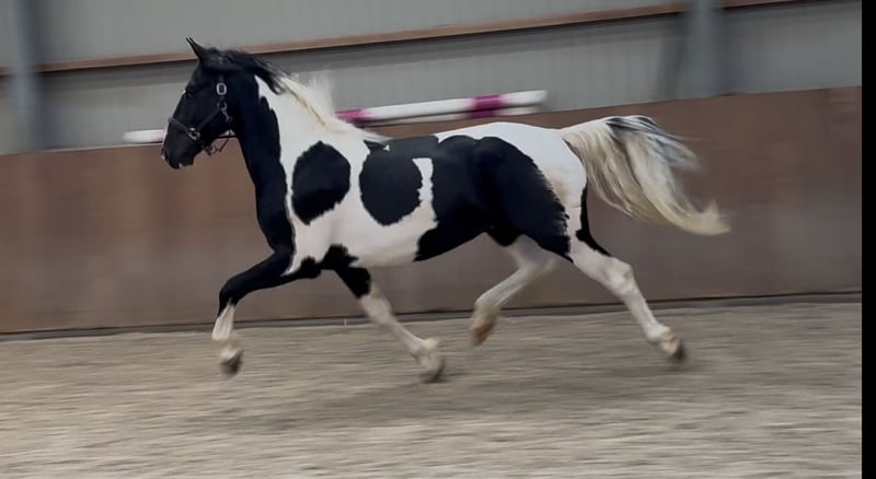 Opvallend mooie 3,5jr zwart bonte hengst. Hij is super mooi platen bont. Het is een echte showbal. Met veel houding afdruk en een super beentechniek loopt hij door de baan. Beschikt over een vol KWPN papier. Bij interesse graag bellen of appen: +31643197337