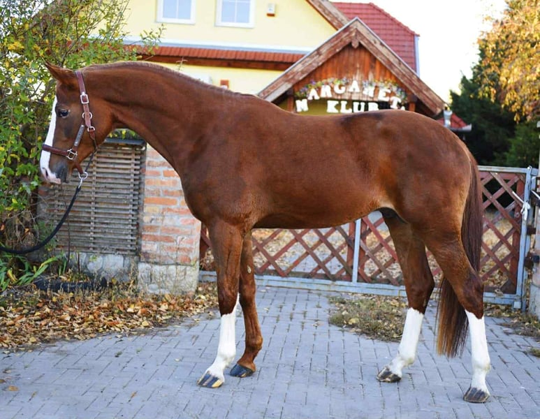 Beautiful young stallion born in 2022, showing great potential for sport and breeding. This elegant chestnut has an excellent conformation, expressive movement, and a kind temperament — a true eye-catcher with a promising future ahead. 🧬 Pedigree Highlights: • Sire: From a very top pedigree, currently active and highly regarded. • Dam: Successfully competed up to 145 cm, proving both talent and athleticism. This young horse combines quality bloodlines, modern type, and scope — perfect for a rider or breeder looking for a serious prospect. 📞 For more information please contact: +36 30 639 2427 Thank you and all the best! ☺️