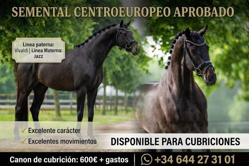 SEMENTAL CENTROEUROPEO APROBADO DISPONIBLE PARA CUBRICIONES Vivaldi X Jazz Excelente carácter y movimientos Alta calidad de semen Envios a toda Europa Canon de cubrición: 600€ mas gastos Whatsapp: +34 644 273 101