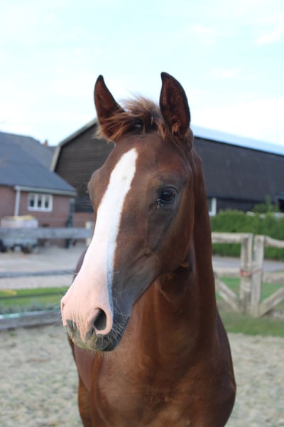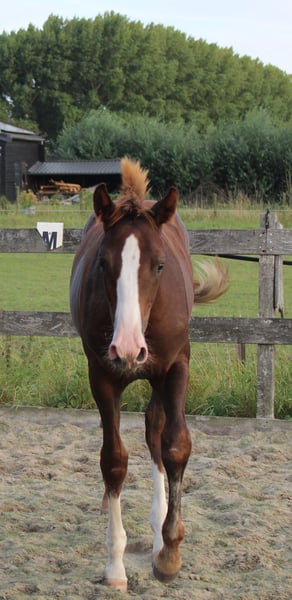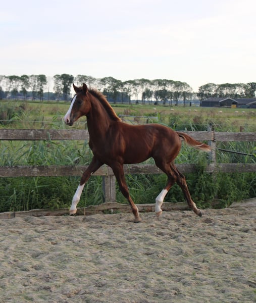 Chique hengstveulen van Newport (Toto jr x Jazz) te koop aangeboden / geboren 26-4-2025. Vino Rosso is een donkere koffievos, goed ontwikkeld met veel houding en beweging (bergop). Hij is goed aan de maat en heeft een fijn karakter. Hij is zeer handzaam en gewend om in een koppel te lopen. Moeder Kiss Me is een voorlopige keurmerrie van Feel Good x Revenge W en heeft een stokmaat van 1.72m. De grootmoeder en een volle 2-jarige zus zijn ook nog in ons bezit. Graag bellen of appen voor meer info of om te komen kijken (tel.nr. 06-33693689).