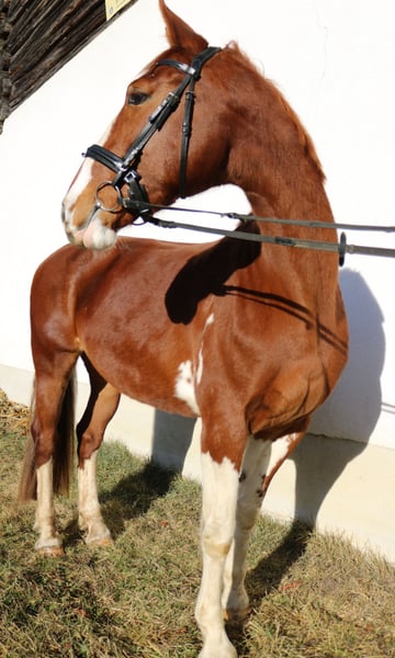 10-year-old KWPN mare (approximately 16.1 hh) with three good basic gaits and excellent quality! Libora is a sensitive, refined horse that always strives to please her rider. Motivated and eager to learn, she requires an experienced owner who can approach her with calmness, clarity, and patience. Baroque Pinto Verband Ster approved.