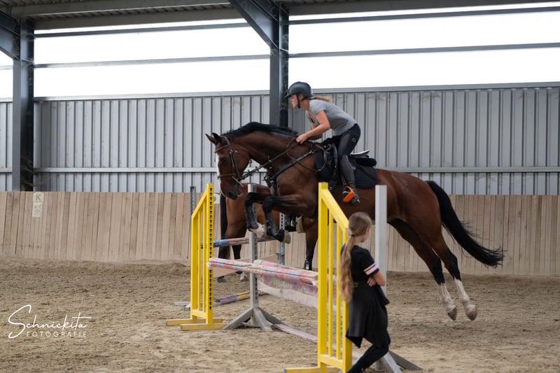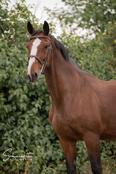 Zum Verkauf steht eine 2014 geborene, etwa 1.72 m große KWPN Stute „Jolina“. Die junge Dame besticht nicht nur mit ihrem liebevollen Wesen und ihrer angenehmen Art, sondern ebenso mit ihrer tollen Optik. Sie ist sehr arbeitswillig, läuft gut in allen drei GGA und zeigt sich dabei stets artig. Jolina besitzt ein angenehmes Go, lässt sich dabei jedoch immer gut regulieren. Allerdings sollte man seine Zügelführung bereits Sitzunanghängig koordinieren können, da sie ungerechtfertigtes herumziehen im Maul nicht mag. Sie hat keine Unarten und steigt oder buckelt nicht. Auch am Sprung zeigt sie eine gute Manier und ist bereits Parcourserfahren. Hierbei zeigt sie sich sehr talentiert, möchte keinen Fehler machen und zieht zum Sprung. Erste Turniererfahrungen durfte sie bei uns ebenso bereits sammeln, wobei sie sich von der Fahrt bis zum Start absolut brav zeigte. Abstammend nach Harley VDL x Indorado stehen ihr bestimmt alle Wege offen, vor allem für jene, die sich ein zukünftiges Sportpferd suchen oder auch als Zuchtstute. Natürlich kennt sie den Hufschmied (läuft derzeit barhuf), den Tierarzt sowie das verladen und fahren. Außerdem wurden bei ihr vor kurzem die Zähne gemacht.