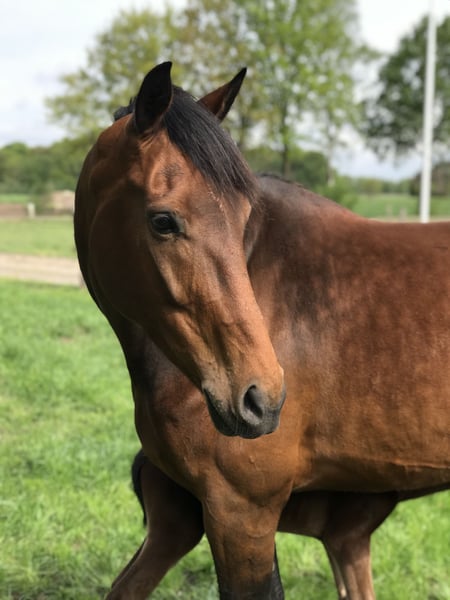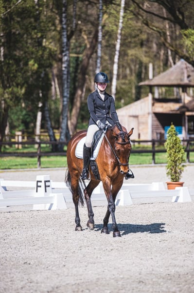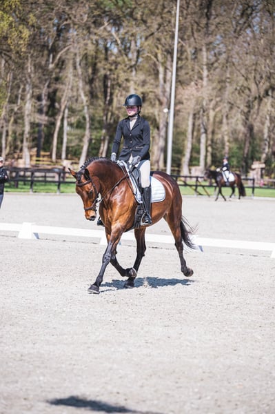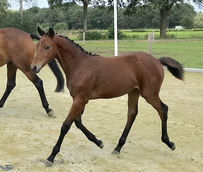 Questa splendida cavalla da dressage, con pedigree Zonik X Farrington, è nata nel 2013 ed ha quindi 12 anni. La sua altezza al garrese è di 1,71 m. È una cavalla dotata di grande elasticità e ottimo movimento. Attualmente è incinta di cinque mesi di Saint McLaren, con parto previsto a metà aprile. La cavalla ha un carattere fantastico, leggermente introverso, molto obbediente in mano, calma anche in scuderia e molto affidabile su terreni sconosciuti. È una cavalla sensibile, che richiede pochi aiuti durante il lavoro, e trasmette una sensazione di guida eccezionale. Purtroppo, la cavalla non è priva di difetti e può essere montata o meno a seconda delle occasioni. Sta tornando sulla buona strada. Dopo numerosi controlli approfonditi, non è ancora chiaro quale sia il problema esatto. Ha un tallone inclinato e su quella zampa si presenta spesso zoppicante; un'iniezione nell'articolazione del tallone ha risolto temporaneamente il problema, come abbiamo fatto recentemente per la seconda volta. È necessario farla stare con ferri di supporto anteriori. Ha documenti eccezionali e, per la quarta volta nella sua vita, è rimasta incinta al primo tentativo. In passato sono state fatte delle competizioni con lei, ma non la vendiamo come cavallo da sport. È molto probabile che possa essere utilizzata per il piacere, e oltre a ciò, è una bellissima cavalla da riproduzione con un puledro in grembo! Viene venduta con il cuore pesante a causa di circostanze personali; è importante trovare una buona sistemazione!