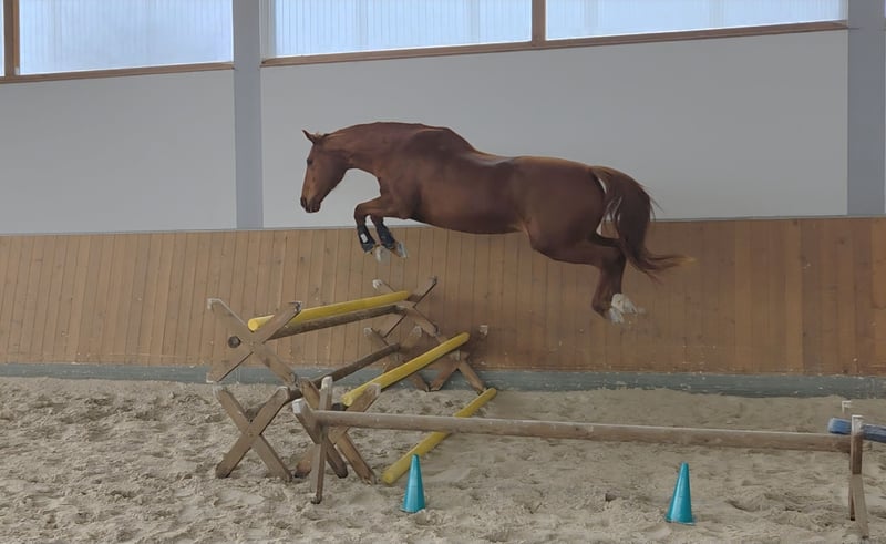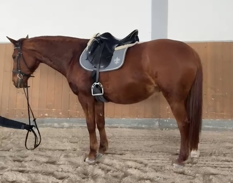 i.A. KWPN 14 jährige Fuchsstute aus Zeitmangel an Bestplatz abzugeben. Absolut Platz vor Preis, am liebsten Endplatz. Ehrliche brave Stute 1,65m groß, unerschrockener unverbrauchter Typ. In den letzten Jahren ausschließlich Freizeit geritten, viel Gelände. Lief als Jungpferd beim Vorbesitzer Turniere bis A Springen. Aktuell wird sie dressurmäsig wieder auf A Niveau angeschoben und zeigt sich hier willig mit Freude an der Arbeit. **** Sie war die Jahre über gesund und hat keinerlei Einschränkungen!***** Ideal für Freizeitreiter, Wiedereinsteiger, ambitionierten Freizeitreiter, Turniere bis A Niveau vorstellbar mit passenden Trainer evtl. auch mehr. Aktuell Barhuf und im Offenstall mit Nachts Box. Abstammung mit NL-Papiere vorhanden: Vater Afellay Mutter Uptown Girl Muttervater Pierrot Probereiten ist nach Terminvereinbarung möglich, einfach melden. Beim Freispringen ist sie sehr motiviert und springt ordentlich. Bei Förderung Potenzial vorhanden!