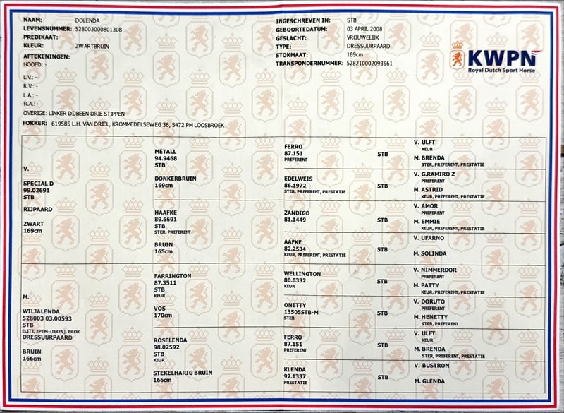 Mare di 17 anni. Allevata per il dressage, alta circa 1,70 m. Ha avuto in passato 6 puledri, l'ultimo nel 2024. Allevata in modo interessante da Special D, da una fattrice ELITE, EPTM (dressage) PROK, figlia di Farrington x fattrice KEUR di Ferro. Fattrice corretta, priva di vizi di stalla e molto dolce nel maneggio. Poiché siamo già molto impegnati, possiamo offrirla a un prezzo interessante. È adatta per l'allevamento, per il tempo libero e per magari fare ancora qualche prova. Brava ma comunque avanti e un po' molle. Abbiamo un video disponibile sotto sella. Data la prezzo, preferiamo una rapida conclusione. Si trova a Oud Gastel. ☎️ 0031-610197456