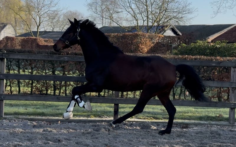 Zeer aansprekende jonge merrie van de getalenteerd hengst This is Naqueen. Deze merrie komt uit een zeer sterke moederlijn met vele Grand Prix en Lichte Tour dressuurpaarden. Beweegt met veel power en goede techniek. 3 Uitstekende gangen. Ruwe diamant, komt recht uit de opfok. Fijn karakter in de omgang. Rontgenologisch gekeurd zonder bemerkingen.