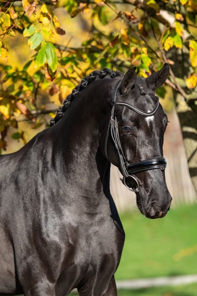 Sweety Noeska, een opvallend mooie zwartbruine merrie van Blue Hors Santiano uit een Fürst Romancier-moeder. Sweety Noeska komt uit een uitzonderlijk sterke moederlijn. Haar grootmoeder Anne v. Tuschinski bracht al twee internationale Grand Prix-paarden: GGH IronMan v. Ferro en Escarigo v. Meastro, en daarnaast het Lichte Tour-paard Incredible v. Apache. Dit maakt haar afkomst bijzonder interessant voor zowel sport als fokkerij. De vader Blue Hors Santiano (Sezuan x Romanov) staat bekend om zijn krachtige bewegingsvorm, elegantie en rijdbaarheid. De invloed van Fürst Romancier aan moederszijde versterkt dit met zijn vermogen om nuchtere, werkwillige en talentvolle dressuurpaarden te geven. Sweety Noeska is WFFS-negatief en beschikt over een goede DO C-waarde, wat haar extra geschikt maakt voor een verantwoorde fokkerij. Ze toont veel balans, souplesse en een moderne uitstraling met drie correcte basisgangen. Een merrie met een bewezen moederlijn, gezonde basis en opvallend veel kwaliteit – klaar om verder op te leiden voor de sport of in te zetten in een serieuze fokkerij. Sweety Noeska: genetisch goud met uitstraling, gezondheid en potentie.