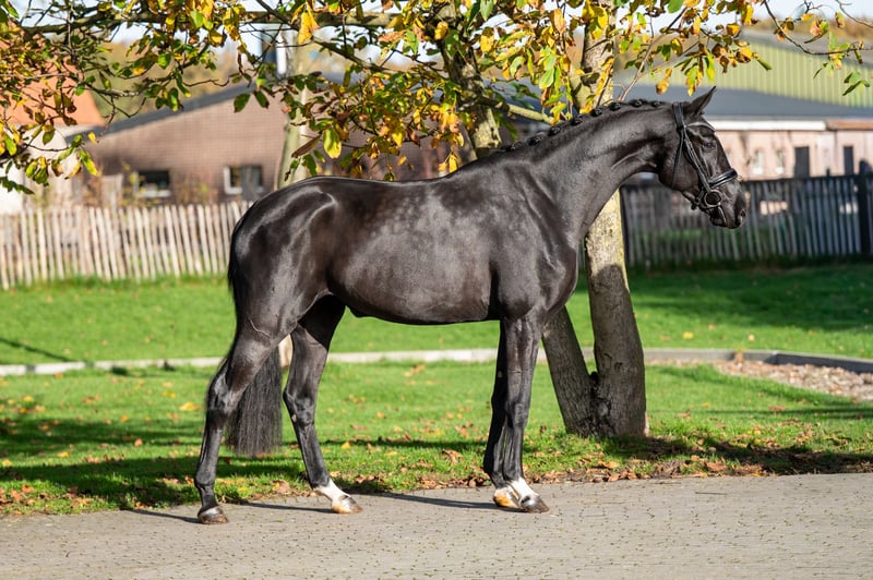 Sweety Noeska, eine ausdrucksstarke dunkelbraune Stute von Blue Hors Santiano aus einer Fürst Romancier-Mutter. Sweety Noeska entstammt einer außergewöhnlich erfolgreichen Mutterlinie. Ihre Großmutter Anne v. Tuschinski brachte bereits zwei internationale Grand-Prix-Pferde hervor — GGH IronMan v. Ferro und Escarigo v. Meastro — sowie das Prix-St-Georges-Pferd Incredible v. Apache. Eine Abstammung, die sowohl für Sport als auch für Zucht höchste Qualität verspricht. Ihr Vater Blue Hors Santiano (Sezuan x Romanov) überzeugt durch Kraft, Eleganz und Rittigkeit. Über die Mutterseite bringt Fürst Romancier Leistungsbereitschaft, Ruhe und Talent für den modernen Dressursport mit. Sweety Noeska ist WFFS-negativ und besitzt einen sehr guten DO C-Wert, was sie zu einer sicheren Wahl für verantwortungsvolle Zucht macht. Sie zeigt hervorragende Balance, Geschmeidigkeit und ein modernes Erscheinungsbild mit drei korrekten Grundgangarten. Eine Stute mit bewährter Mutterlinie, solider Gesundheit und außergewöhnlicher Qualität — bereit für eine erfolgreiche sportliche Karriere oder als wertvolle Zuchtstute. Sweety Noeska: genetische Stärke, Eleganz und Zukunftspotenzial.