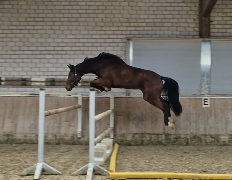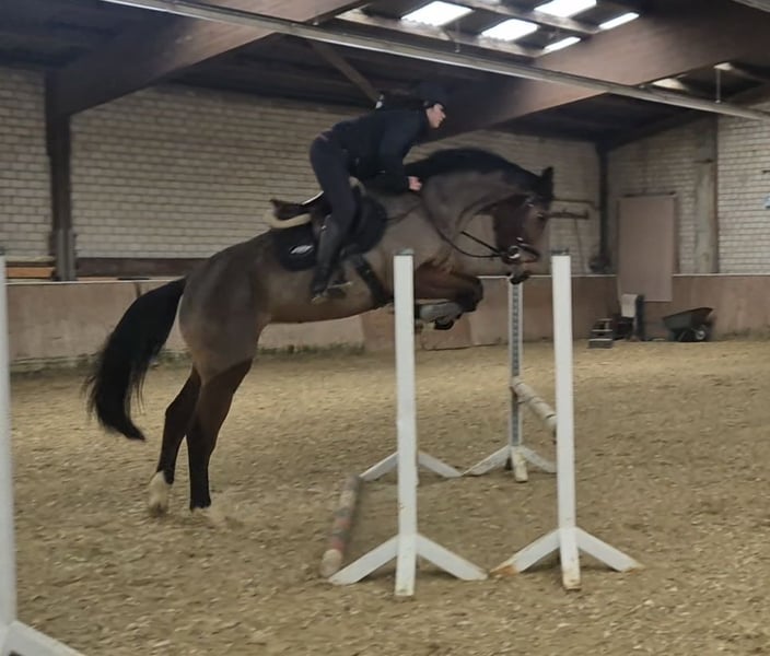 Very beautiful mare by Socrates vd Bosdam (Eras St. Hermelle) x Glennridge. From the same dam, there are already two successful jumping horses up to 1.50 m. Current height approximately 16.9 hh / 17.0 hh. She already jumps a small course and demonstrates a lot of talent. Also very pleasant to ride in dressage. Possesses three above-average gaits. A good veterinary certificate is available.