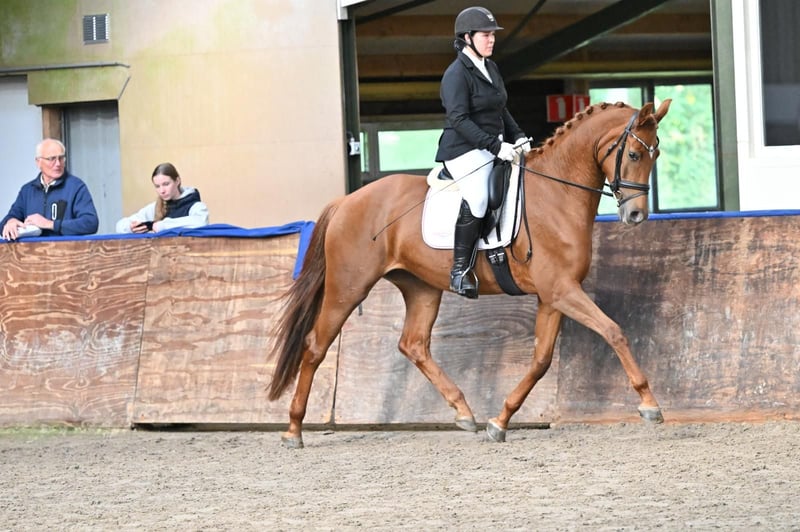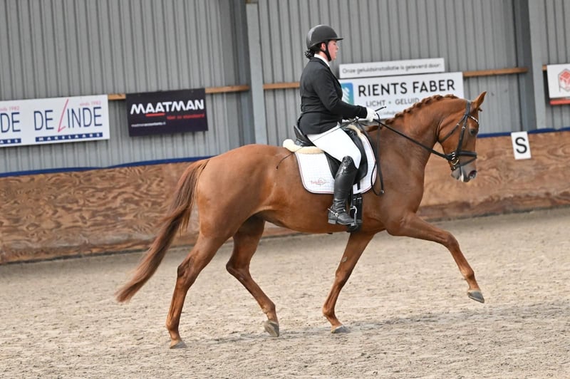 Ta klacz zdobyła tytuł mistrzyni na przeglądzie klaczy w Gelderland/Flevoland w tym roku w kategorii klaczy czteroletnich i starszych. Dwa tygodnie temu uzyskała wynik IBOP z wynikiem 82 punktów: 7,5 chód krok, 8,5 chód galop, 8,5 chód stęp, 8,0 elastyczność, 8,5 postura i równowaga, 8,5 ujeżdżalność, 8,0 predyspozycje do ujeżdżenia. Ponieważ nie została jeszcze oceniona przez profesjonalnego lekarza weterynarii, obecnie posiada status „Keur”, ale nie jest jeszcze elitarna. Obecnie odnosi sukcesy w konkursach na poziomie L2 w ujeżdżeniu. Matka jest klasyfikowana w kategorii Inter I i jest w treningu do Inter II. W wieku 5 lat startowała na Mistrzostwach Świata Młodych Koni. Z tej samej matki pochodzą już dwa zatwierdzone ogiery, w tym Dutch Dream. Dostępne zdjęcia rentgenowskie. Uwaga! Wszystkie nasze ceny są netto, bez 21% VAT.